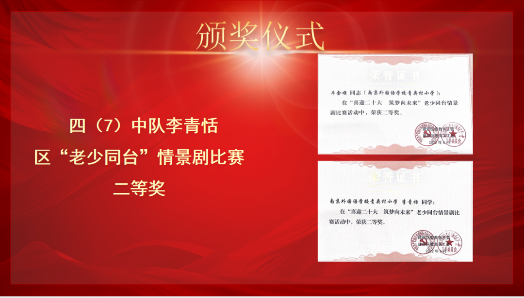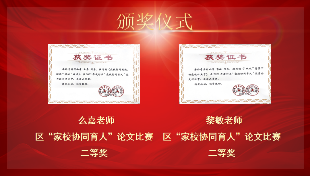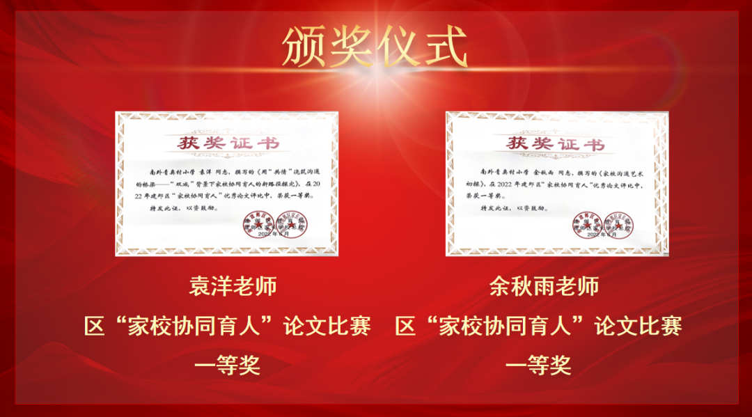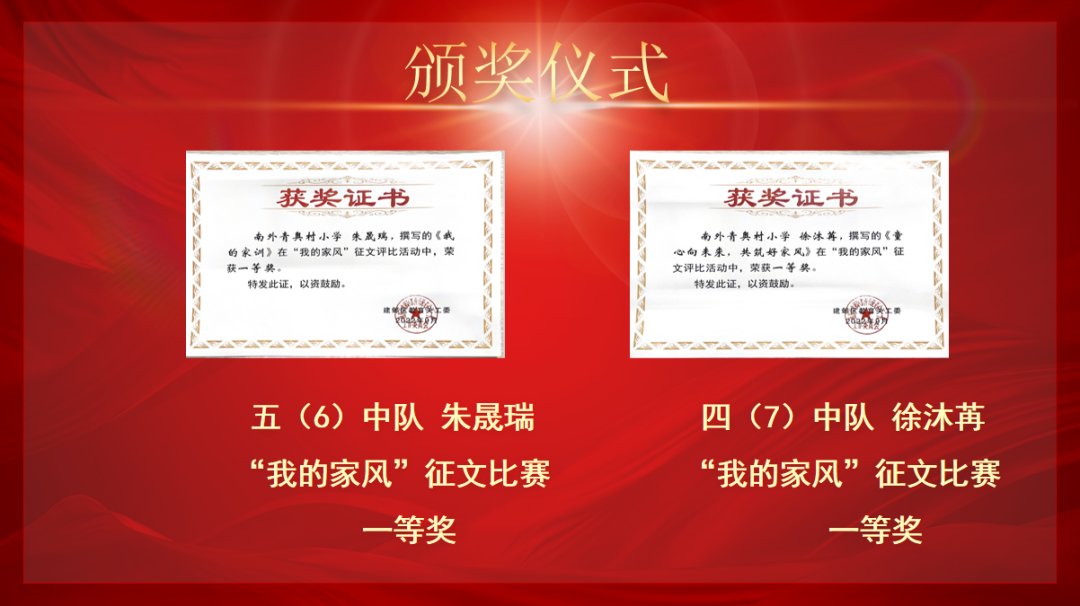 我校四(7)中队李青恬和爷爷以真实经历为素材创编的情景剧《新时代,新生活》荣获区“老少同台”情景剧比赛二等奖!子孙传承家风,是优秀传统的延续。我校五(6)中队朱晟瑞、四(7)中队徐沐苒两名队员在区“我的家风”征文比赛中荣获一等奖。在区“家校协同育人”论文评比中,我校袁洋、余秋雨两位老师荣获一等奖,么嘉、黎敏两位老师荣获二等奖。