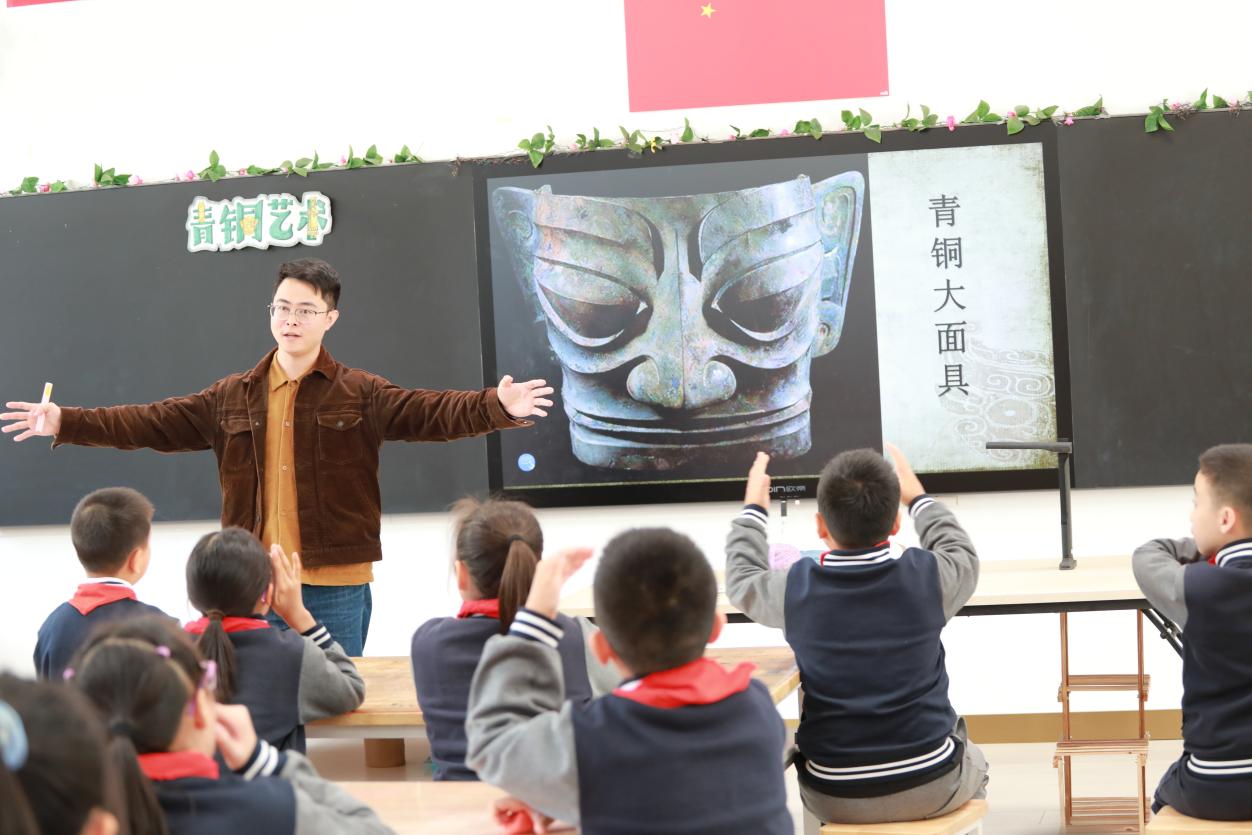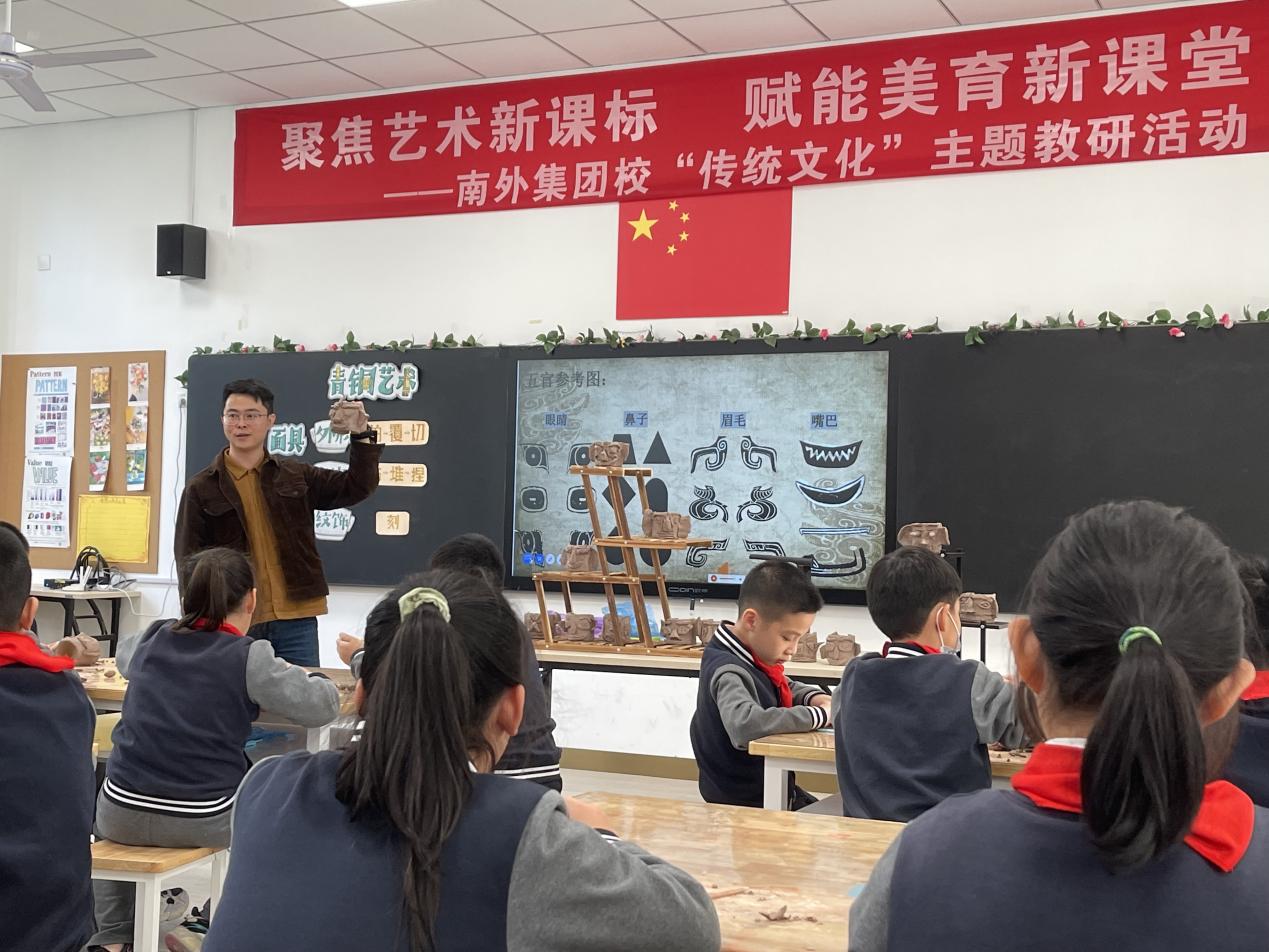 本次活动分为三大板块,第一个活动内容,是我校陈墨老师和南外河西小学部李婵老师的课堂展示。陈老师通过神秘的三星堆文明引发学生的好奇心对《青铜艺术》这节课的探索,通过对青铜面具的深入学习,感受青铜面具的独特魅力。学生用双手感受陶泥特性,运用泥片成型法,拍、切、卷、贴、捏... ...一件件古朴夸张的立体面具诞生了!在愉快的动手中,学生不仅体会到了创作的快乐,更感受到青铜艺术远古魅力和古朴原始的美。