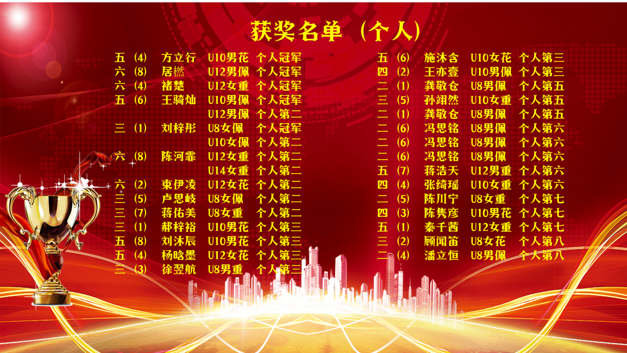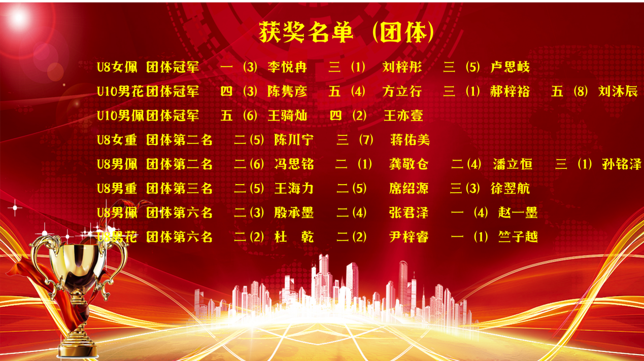 比赛中,59名小剑客不畏强手,顽强拼搏,团结协作,在团体项目中夺得3枚金牌、2枚银牌、1枚铜牌,个人项目中夺得5枚金牌、8枚银牌、7枚铜牌。