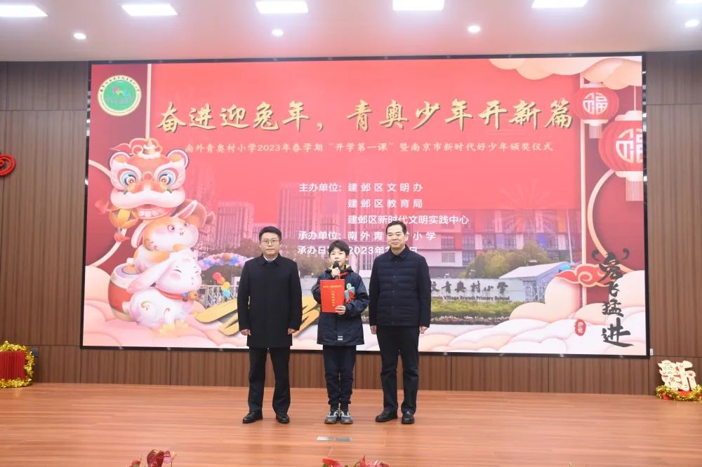活动现场,建邺区教育局局长、局党组书记吴坤明和建邺区教育局四级调研员陈国庆为六(2)班的刘牧宸同学颁发南京市“新时代好少年”证书,鼓励青奥学子们以他为榜样,争做德智体美劳全面发展的社会主义接班人。刘牧宸接过奖状后,对两位领导表达了感谢,表示一定不会辜负大家的希望,并呼吁大家好好学习,天天向上,做新时代的好少年!