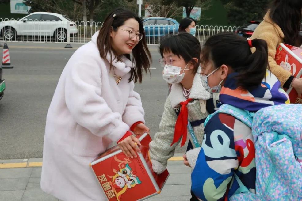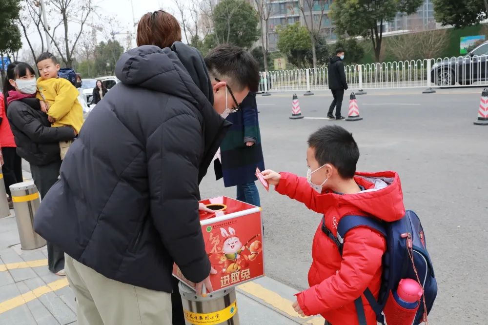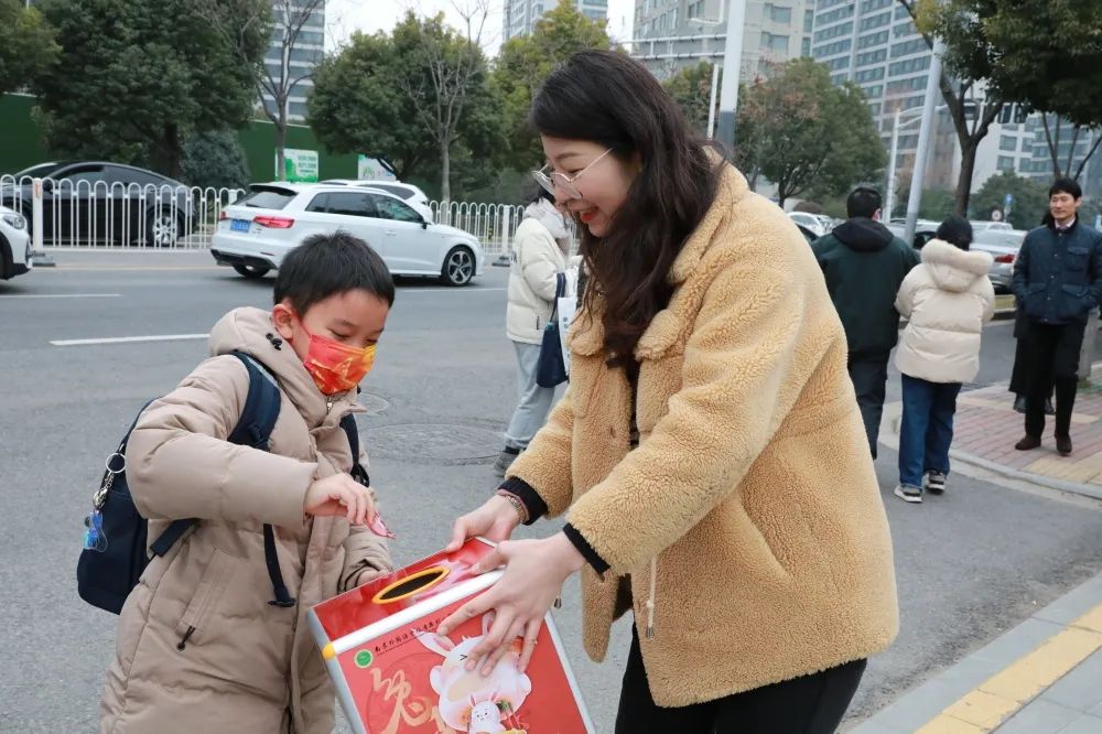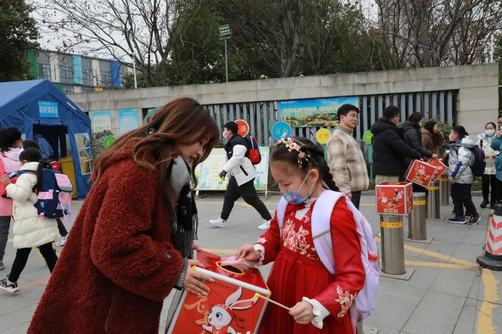 瞧!学校大门外,几位手捧抽卡箱的老师,亲切地邀请每一位同学抽“福兔卡”:“来,抽一张你的2023福兔卡吧!”大家一个接一个走上前,满心期待地抽取出自己的2023福兔卡。“我是健康兔!”“我是进取兔!”……孩子们兴奋地互相交流起自己抽到的“福兔卡”。