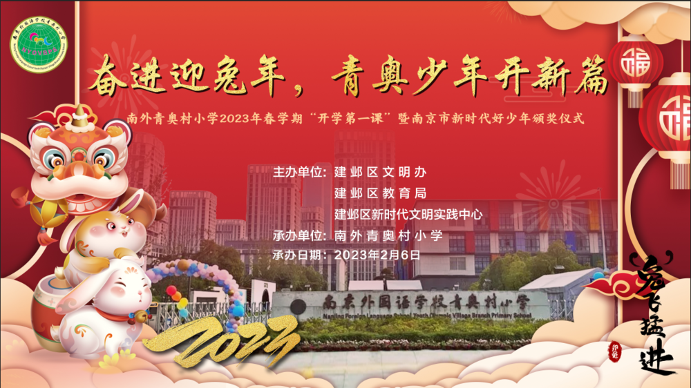 今天上午,以“奋进迎兔年,青奥少年开新篇”为主题的南外青奥村小学新学期开学典礼在报告厅以直播的形式举行。