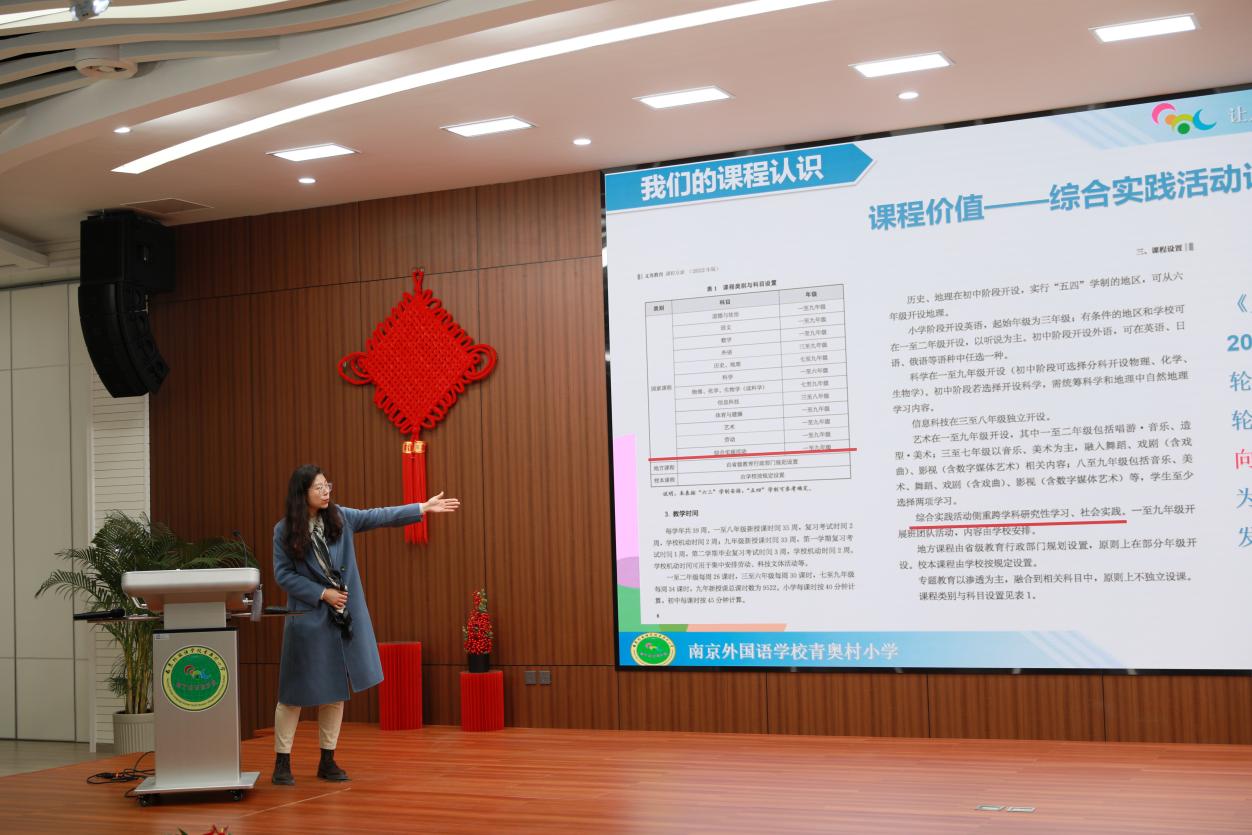 章晗老师着重汇报了我校在综合实践活动课程内容上的探索。以《设计一周的营养食谱》为例,分享我校在联结儿童家校生活方面的探索;以《爱心认养》《我是环保小局长》为例阐述我校对儿童家校、社区生活的关注;以《策划十岁成长礼》《我为母校献一份力》等案例分享在联结儿童当下与未来生活中的探索。