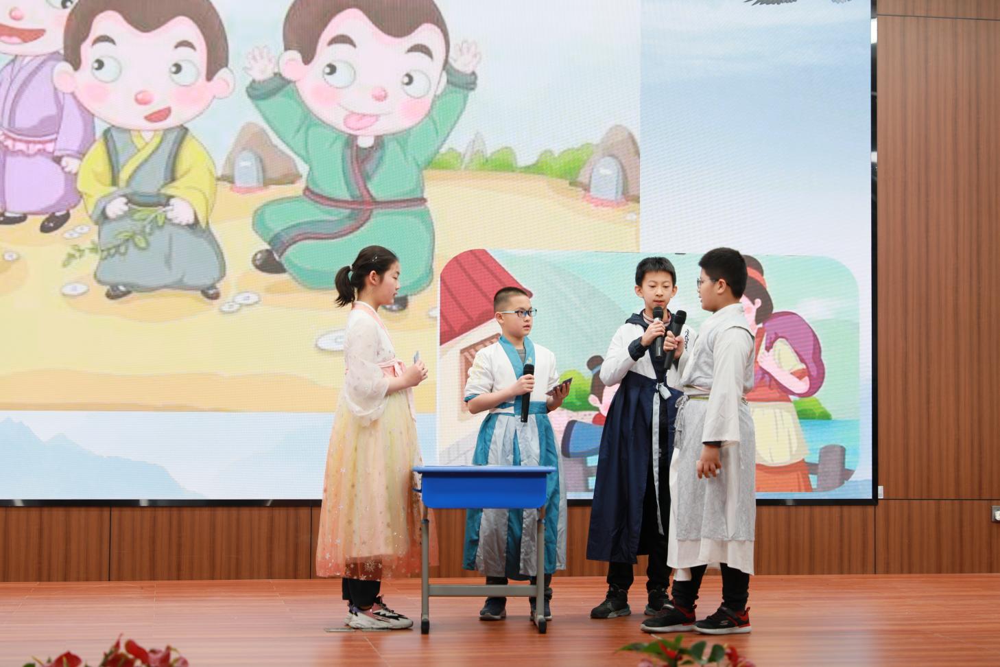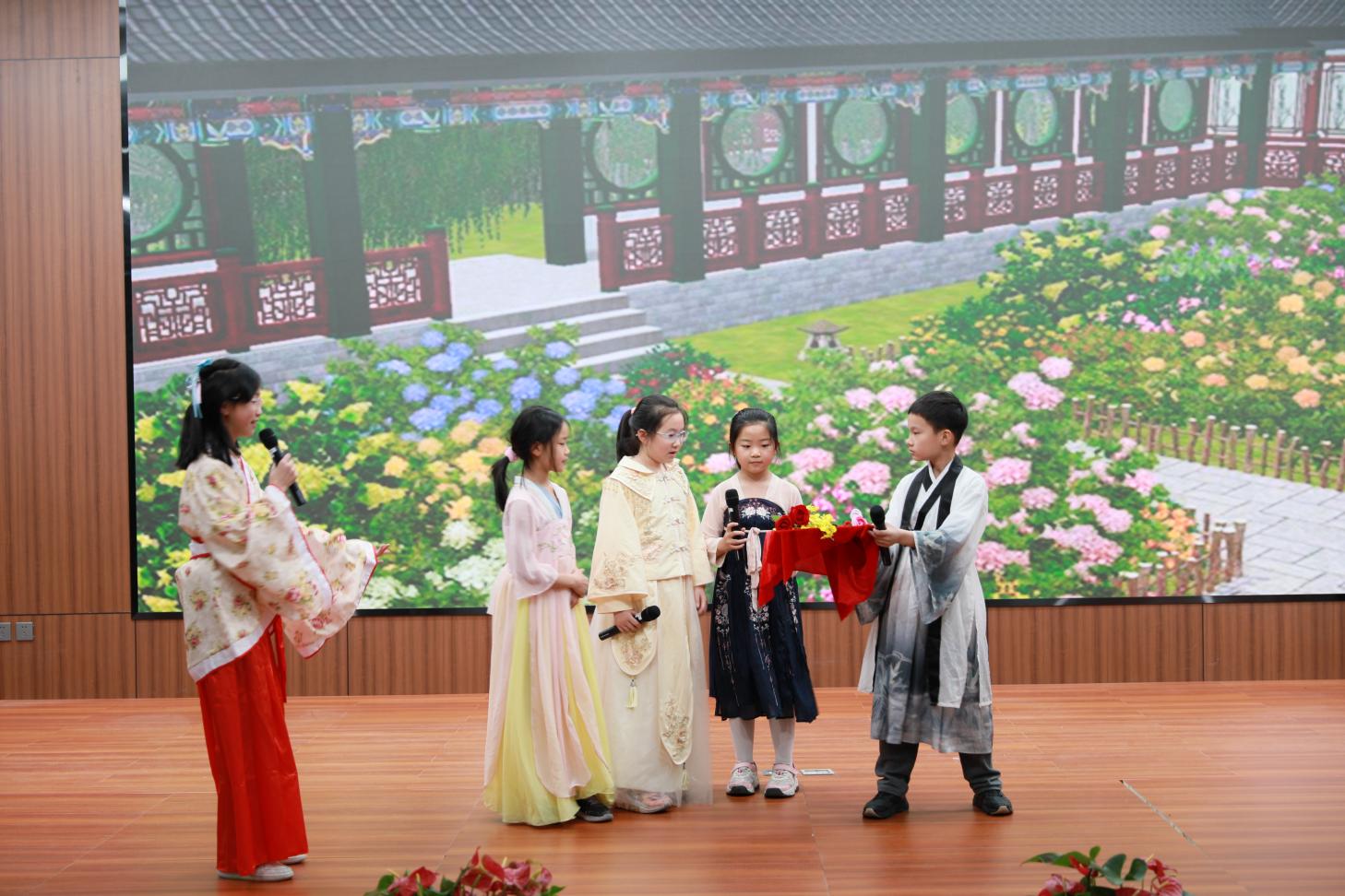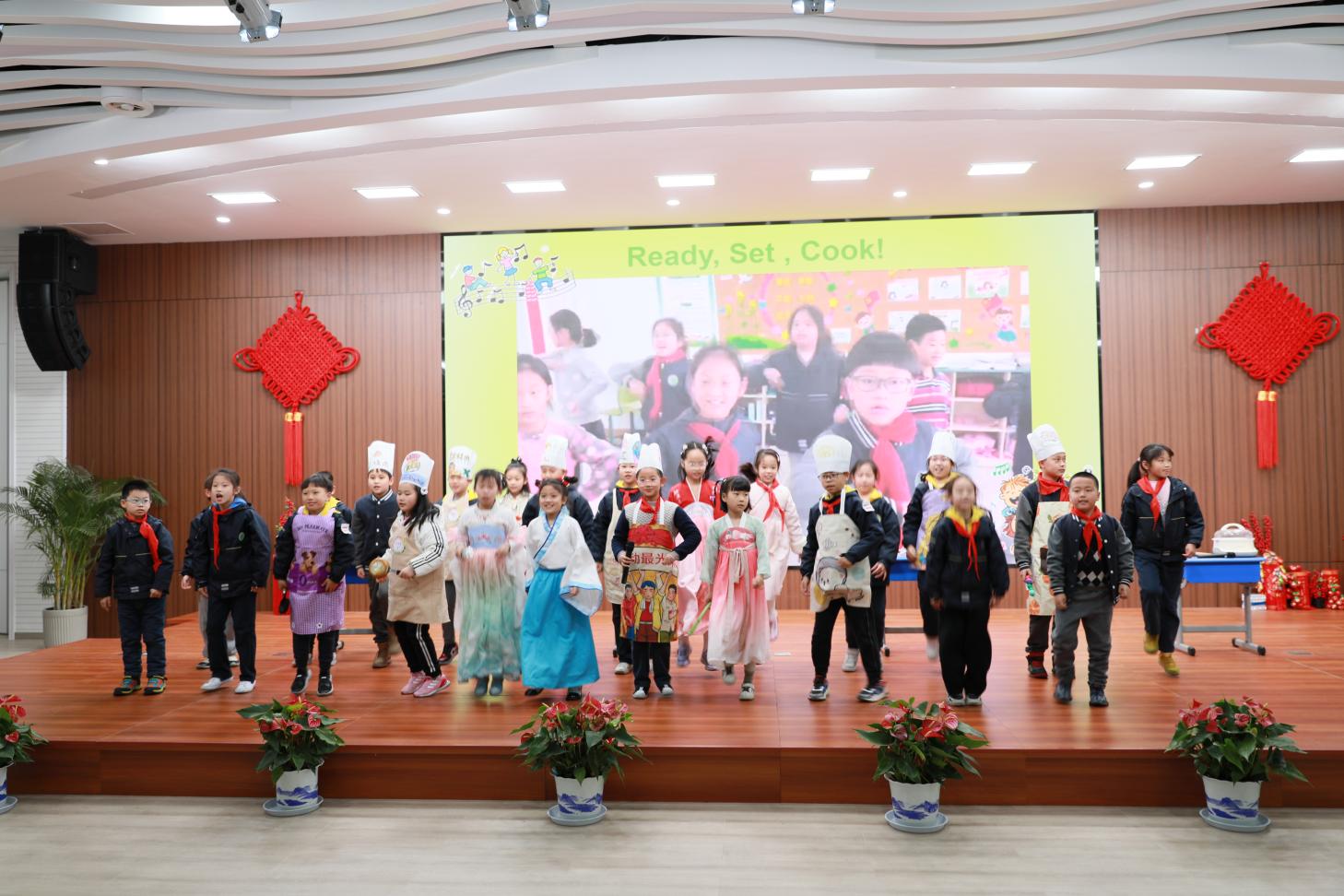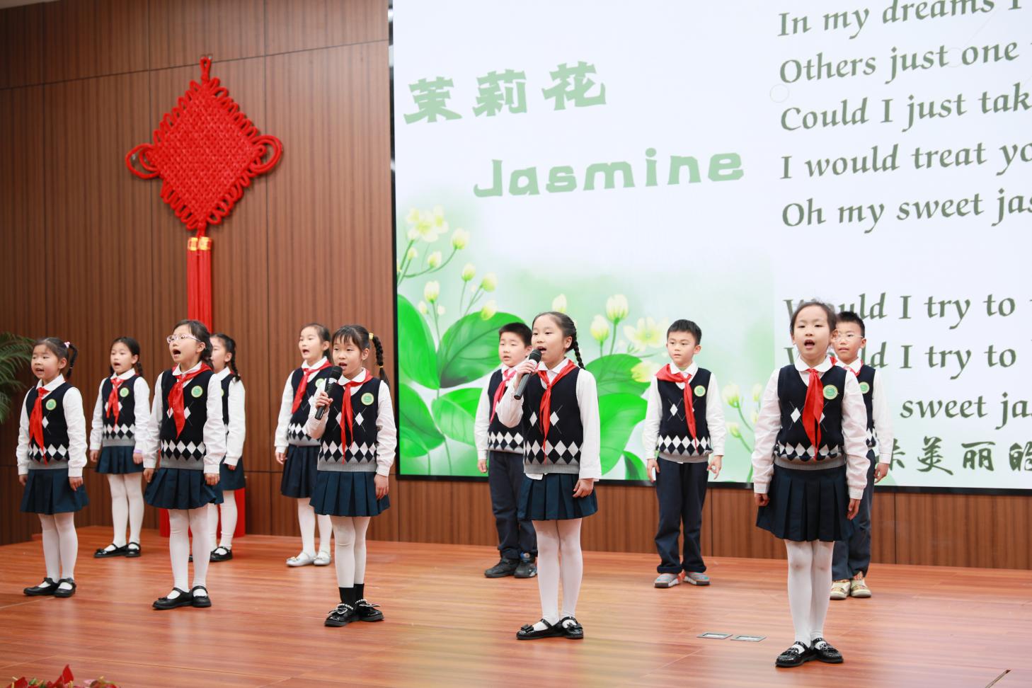 张艾嘉、张湘玲两位老师携手一年级的何一白、二年级的夏禾然、三年级的于童语、四年级的蔡昊雨、五年级的王品朝和六年级的王予恬共同主持了本次外语节的闭幕式。