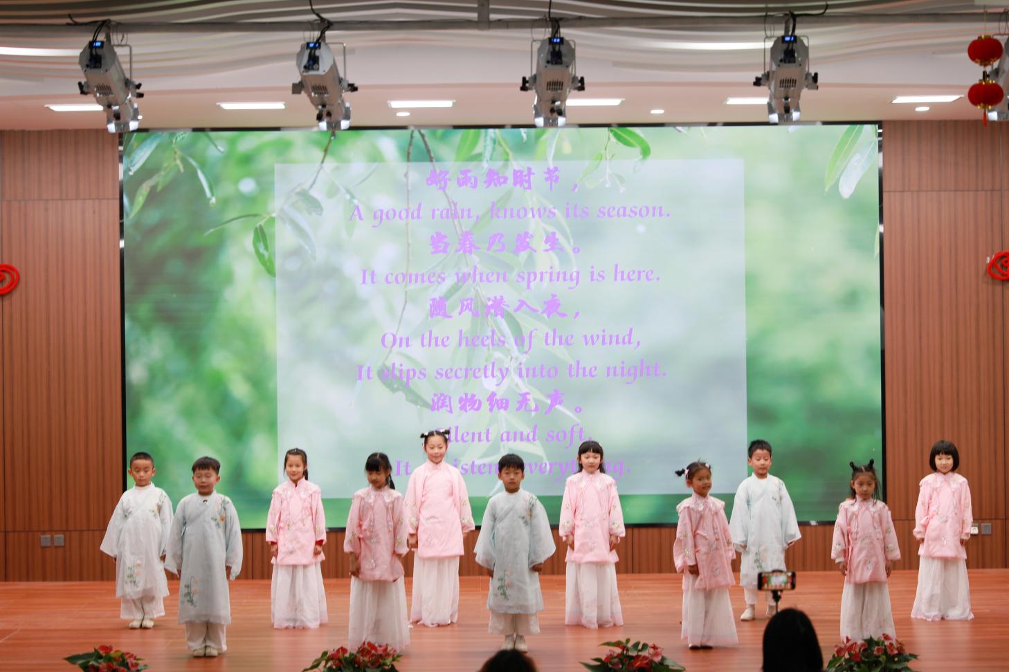 一二年级的孩子们以歌曲、舞蹈、和朗诵等多种形式歌颂了祖国山水与季节变化之美。看!他们用抑扬顿挫的语调和丰富的肢体动作朗诵着美妙的中英文诗句。听!他们用清亮的童声演唱着英文版的中国歌谣。孩子们化身文化小播客,尽显中国山水之美,感受中英文语言魅力。Let’s enjoy the beauty of four seasons and listen to the nice poems.
