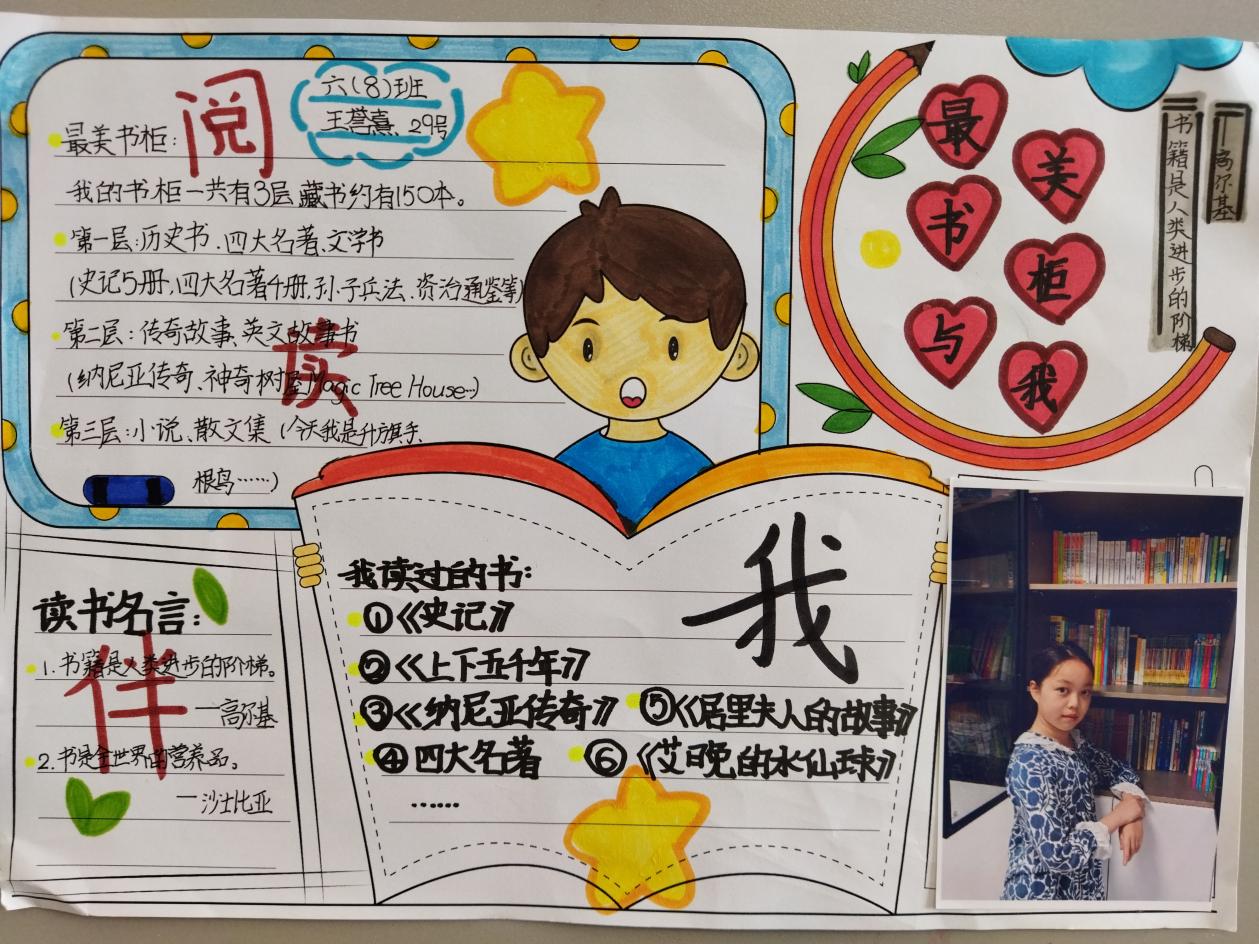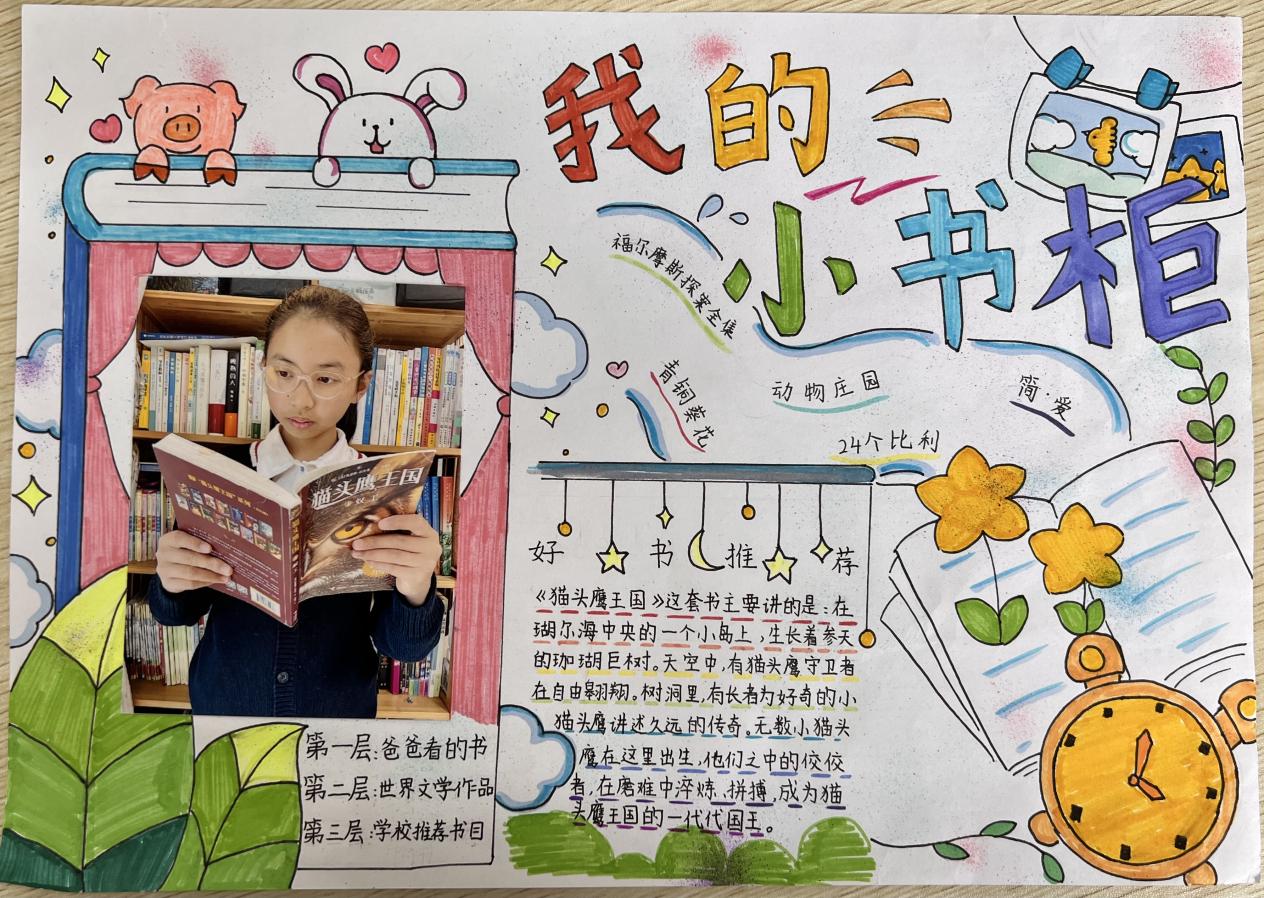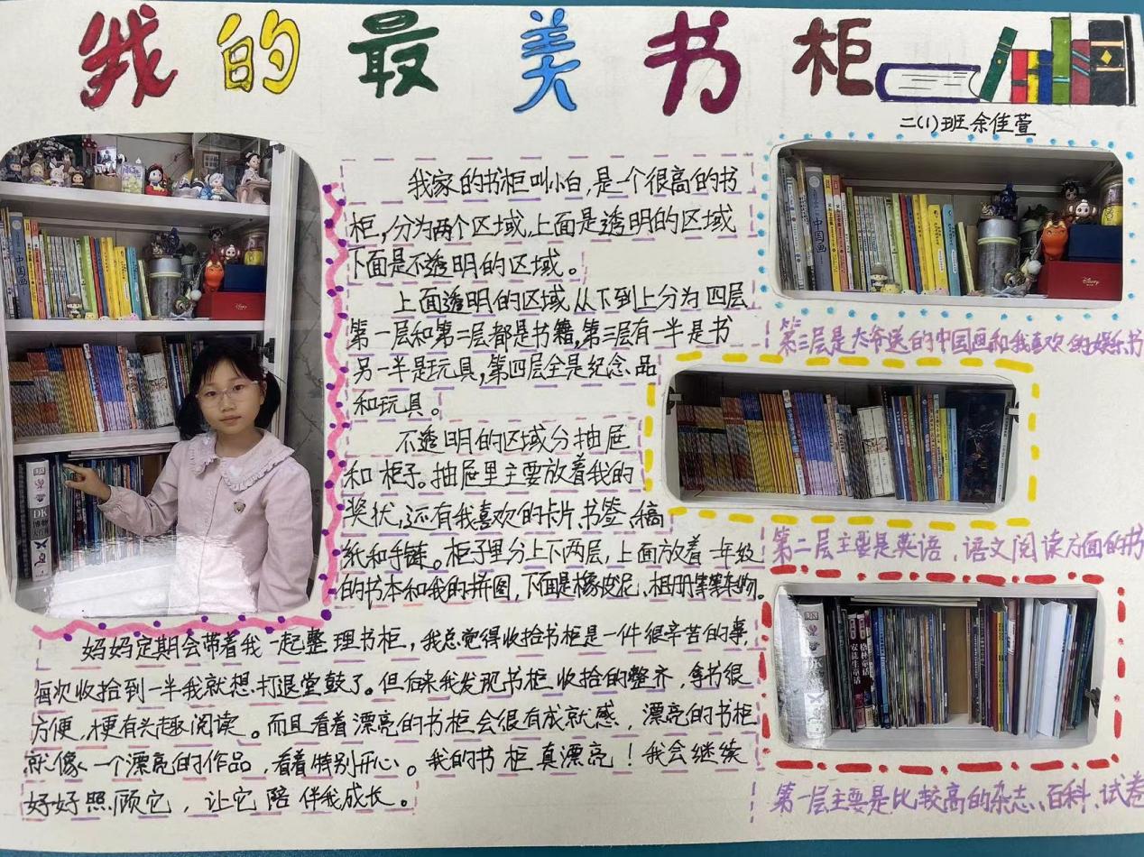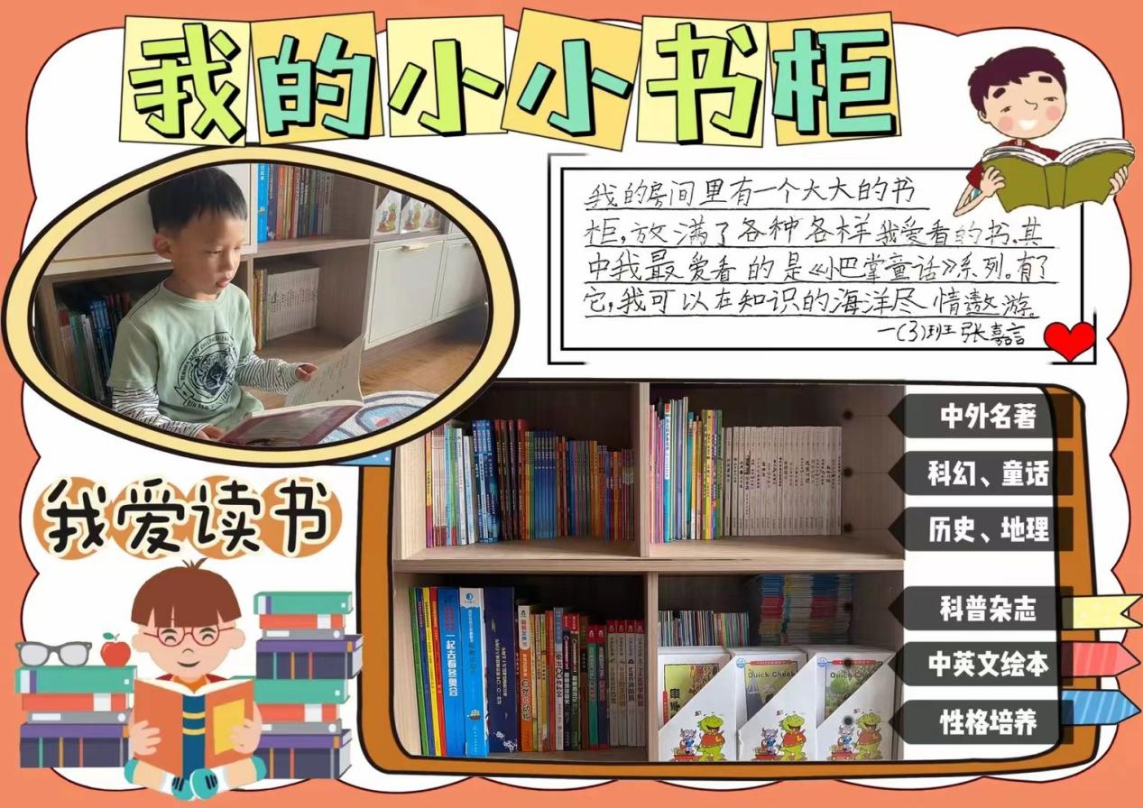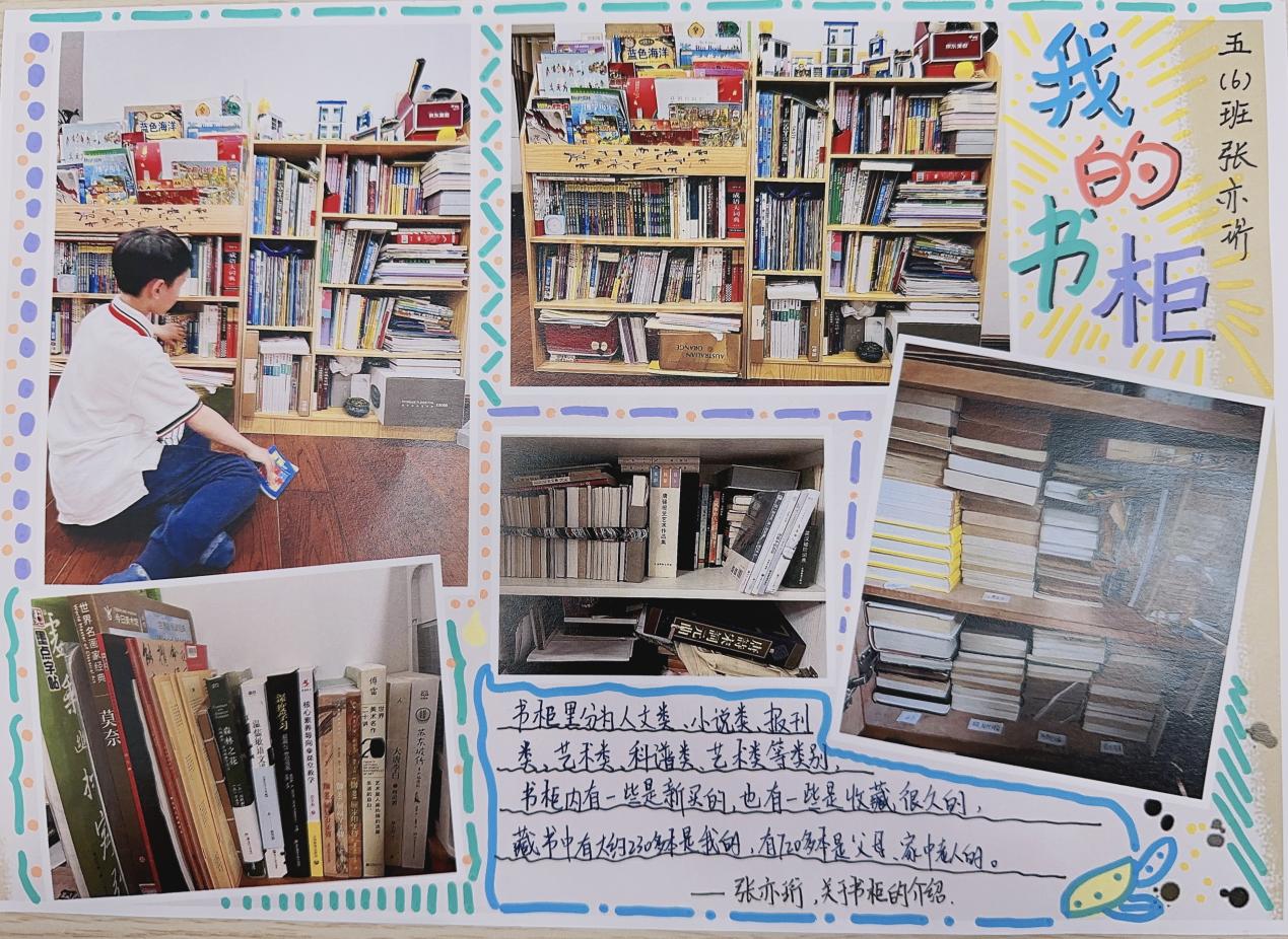 活动中,同学们统计了自己家的藏书情况,也有同学先了解书籍分类的相关知识,再根据家里实际情况进行分类整理、有序摆放,最后,再从书柜名称、藏书分类、藏书册数、整理书柜的感想、推荐书柜的理由等方面进行描述,以照片配文字的方式制作小报进行呈现。