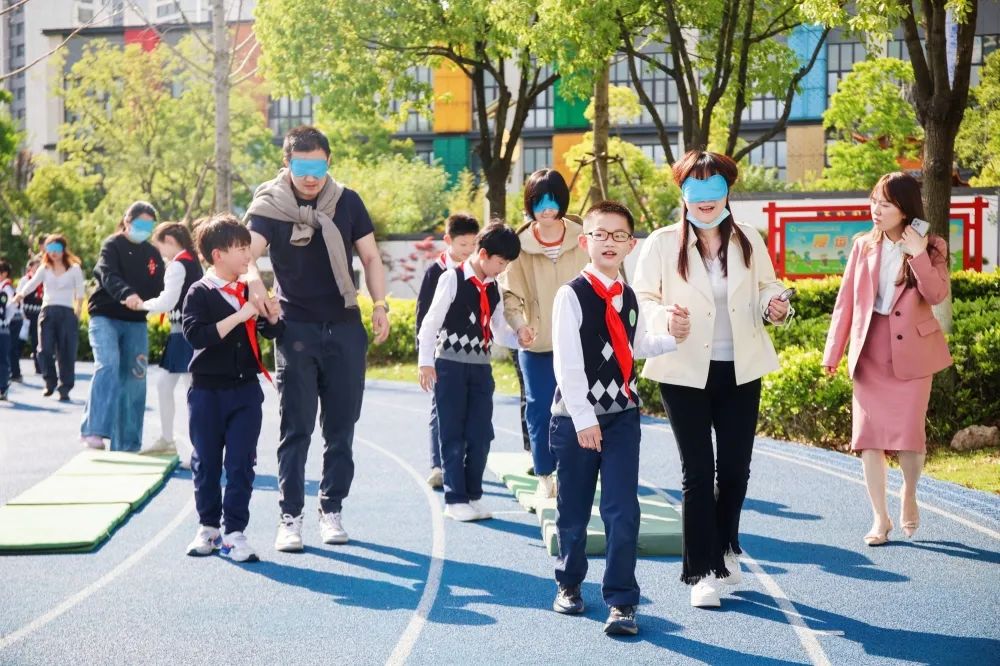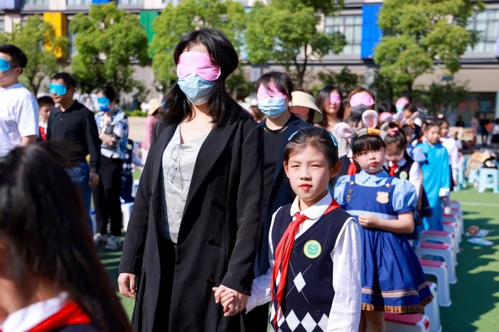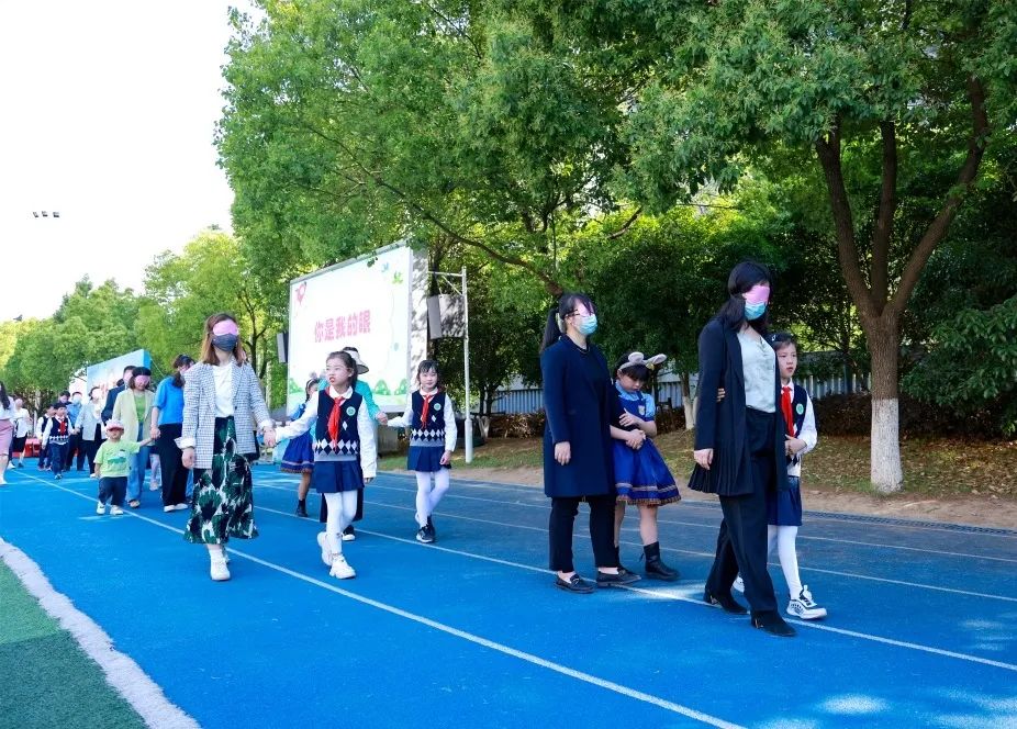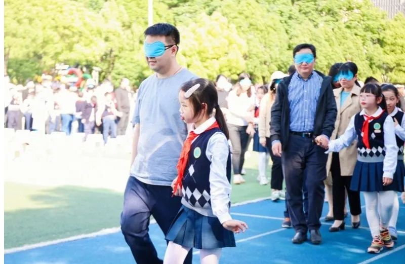 父母们戴上眼罩,把手交给孩子。在孩子们的带领下,家长们蒙眼跨越了重重阻碍。孩子们紧握的双手,小心的步伐,无言地诉说着一份承诺:“你牵我长大,我陪你变老。”