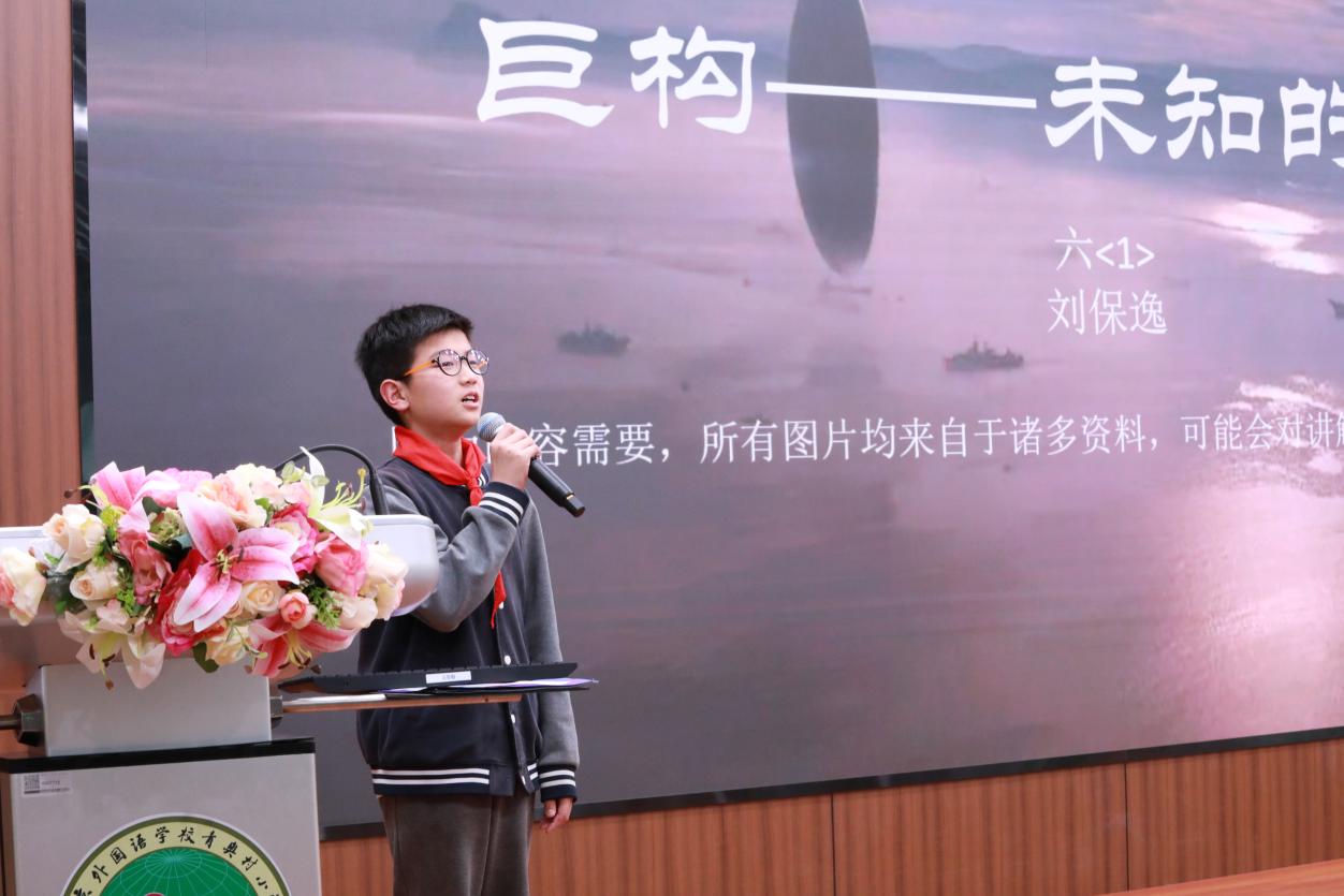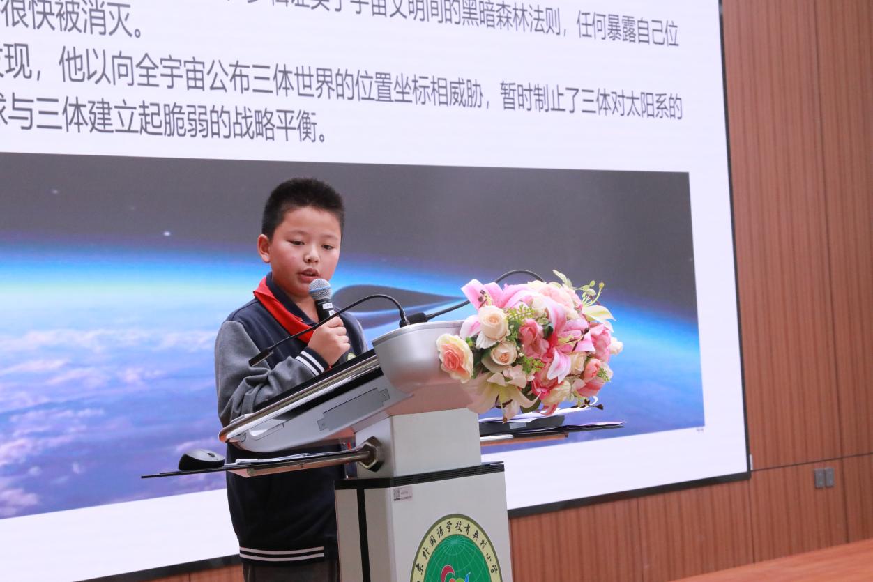五(7)班的帅泓瑞同学带来了著名科幻巨作《三体》的梗概分享。他讲述了故事的精彩内容,赞叹了作者超凡的构思和惊人的想象力。帅泓瑞同学通过《三体》告诉大家:恢宏的科幻小说创作,离不开天马行空的想象与丰厚的科学知识积淀。