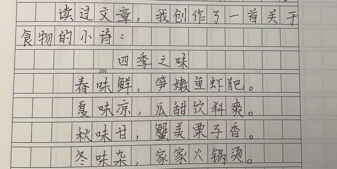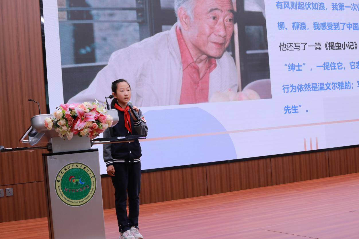四8班的孙意乔同学与大家分享了汪曾祺的《五味》。她先介绍了书本的内容,接着简述了阅读带给她的收获,倡议大家像汪曾祺先生学习,多留心生活,用笔尖书写精彩。孙意乔同学最后还展示了读完《五味》后的诗歌创作: