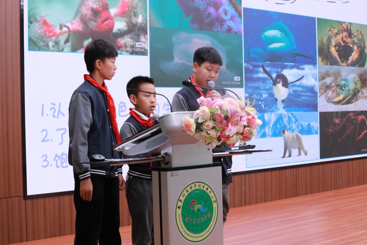 五2班的叶子青、黄慕矪、张隽泽三位同学共同为大家分享了BBC的纪录片《蓝色星球》。史诗般的海洋,全纪录独家拍摄的珍贵画面,让同学们见识到海洋最神秘的一面。三位同学还发出呼吁:保护海洋环境,科学开采海洋资源。