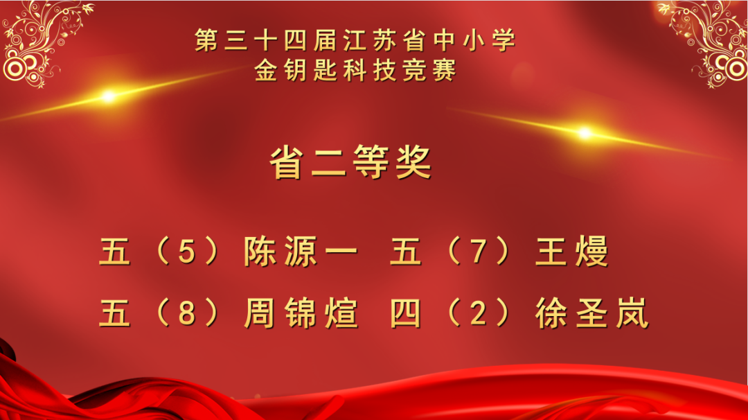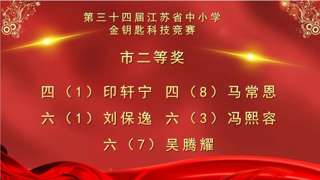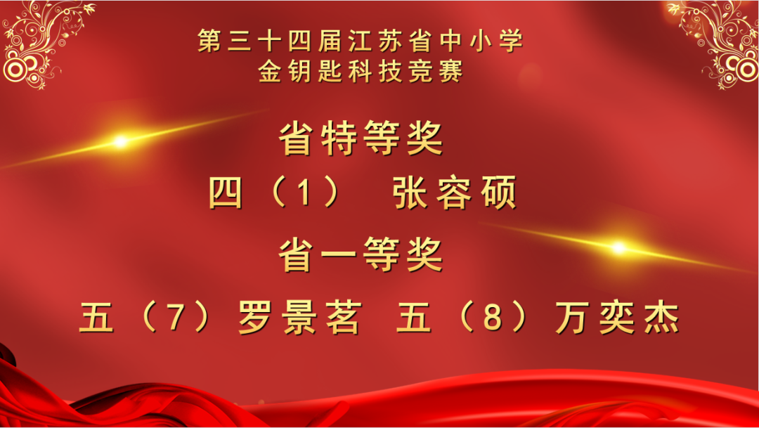 金钥匙科技活动是我省覆盖面最广,参与人数最多,影响最为广泛的青少年科学竞赛活动。本次竞赛中多位同学获奖,其中张容硕荣获江苏省特等奖;罗景茗、万奕杰两位同学荣获江苏省一等奖;徐圣岚等4名同学荣获江苏省二等奖。