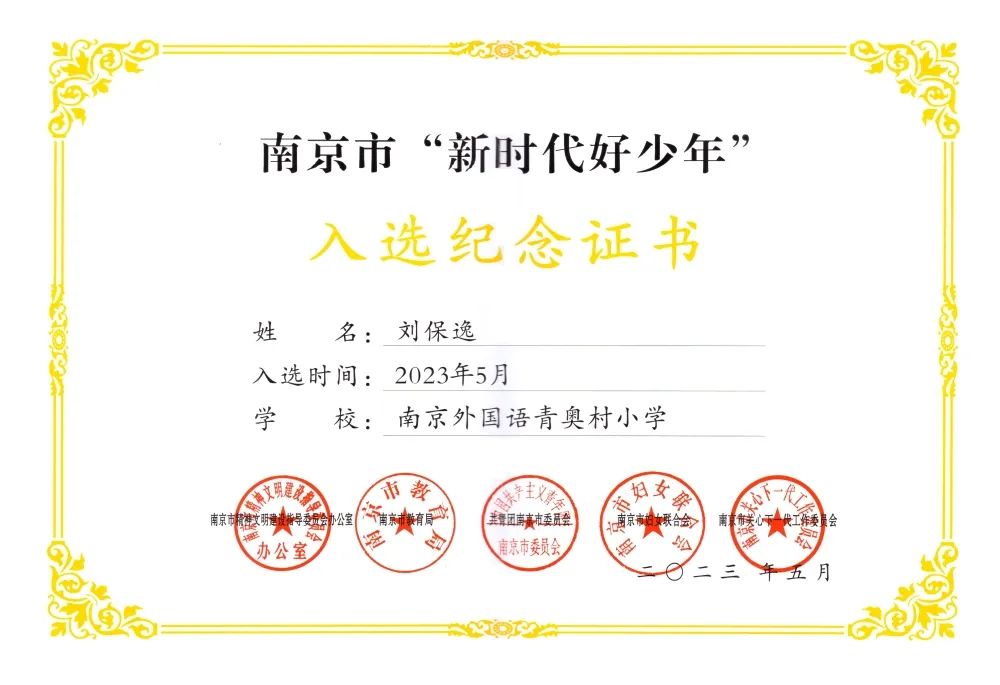 2023年5月30日,由南京市文明办、市教育局、团市委、市妇联、市关工委主办的2023年南京市新时代好少年先进事迹发布会在南京市雨花台中学举行。我校六(1)班刘保逸同学作为2023年南京市第一批“新时代好少年”受邀参加了本次发布会。