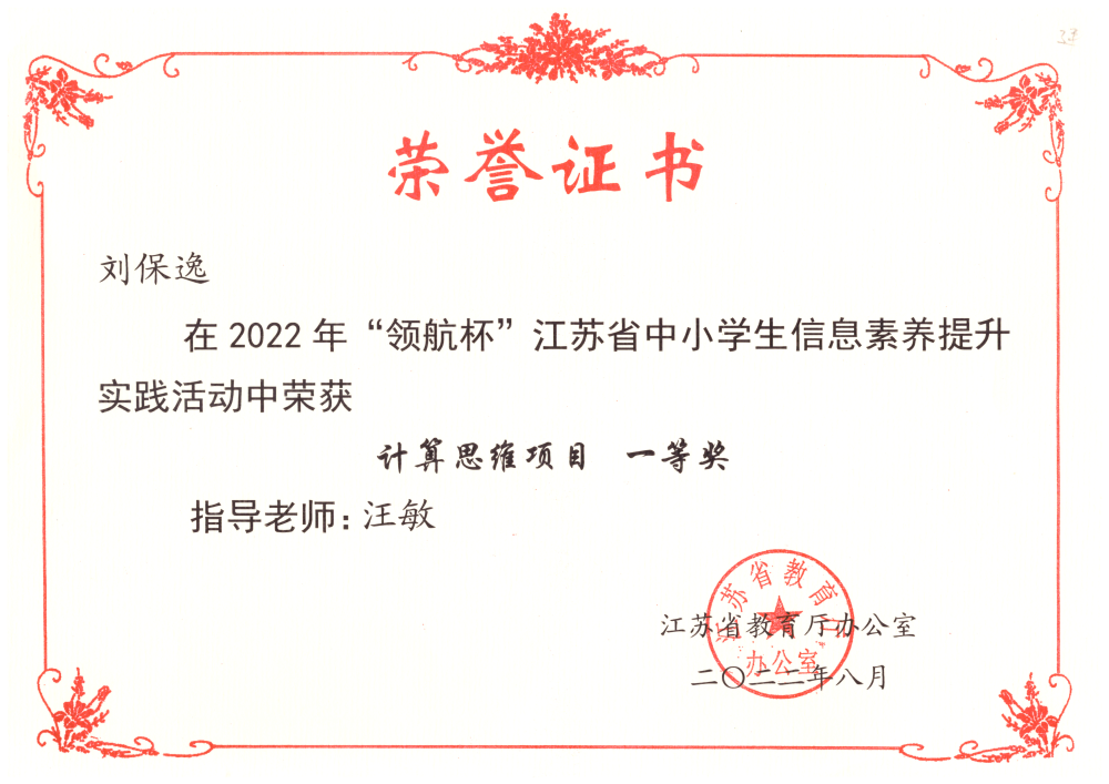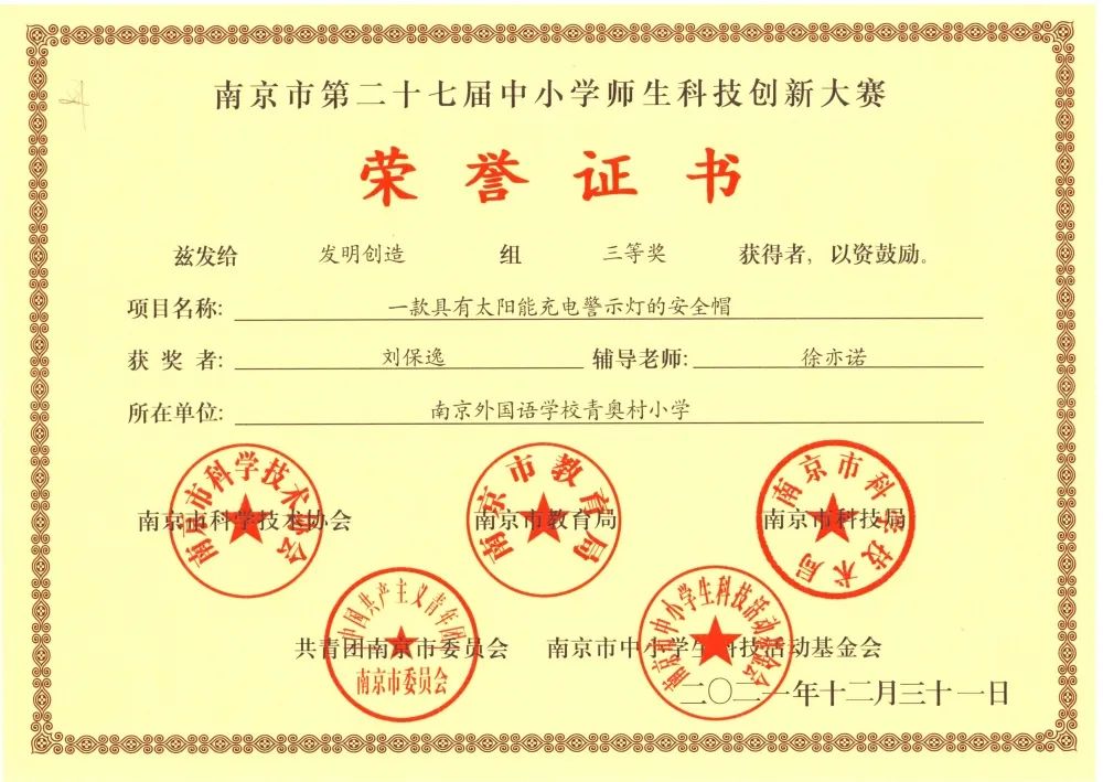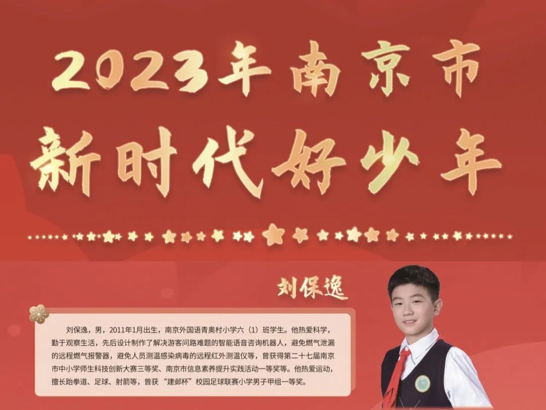 刘保逸同学热爱科学、勇于探索,善于观察生活,先后设计制作了解决游客问路难题的智能语音咨询机器人,避免燃气泄露的远程燃气报警器,避免人员测温感染新冠病毒的远程红外测温仪等,获得第二十七届南京市中小学师生科技创新大赛三等奖、南京市信息素养提升实践活动一等奖等。他热爱运动,擅长跆拳道、足球、射箭等,曾获 “建邺杯”校园足球联赛小学男子甲组一等奖。事迹突出,是新时代好少年的典型代表。