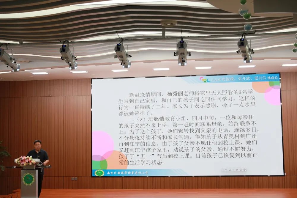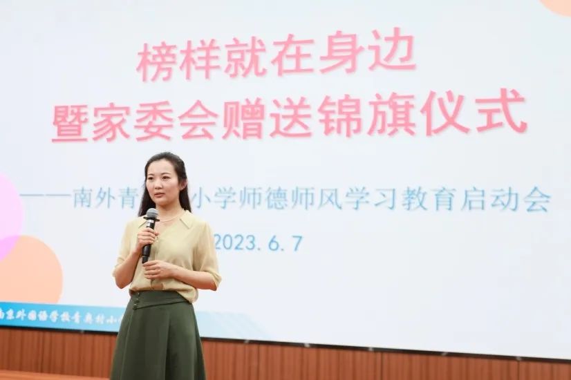 班主任万老师作为教师代表发言:“每个孩子的成长离不开老师、家长、学校和学生的共同努力。三(5)班的老师们只是南外青奥村小学所有老师的缩影,也是每一个把成为一名‘四有’好老师作为自己人生信条的老师们的缩影。”