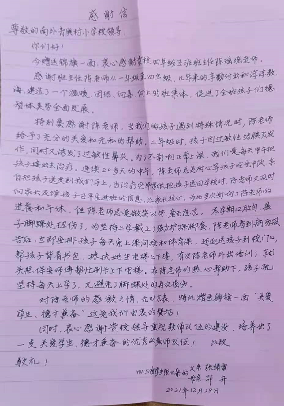 温情伴学暖人心,锦旗相赠寄真情。一面面鲜红的锦旗,是家长对老师工作的认可,是对学校工作的肯定。南外青奥村小学的每一位老师,会继续带着这份热忱,带着这份热爱,陪孩子们一起追逐更好的明天!