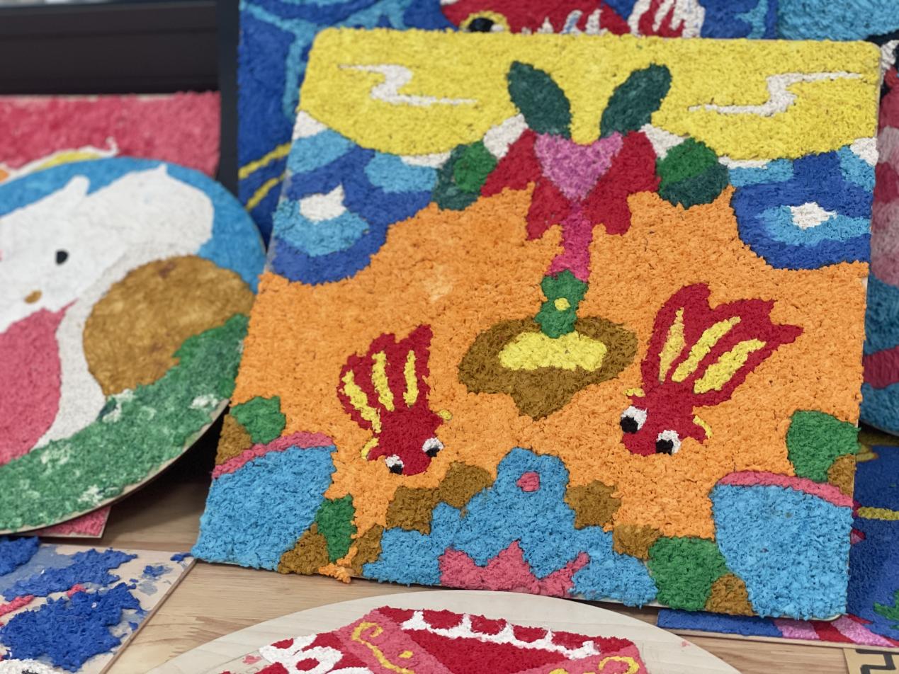 纸浆画:以废纸为主要原料,添加天然色素后进行工艺制作。