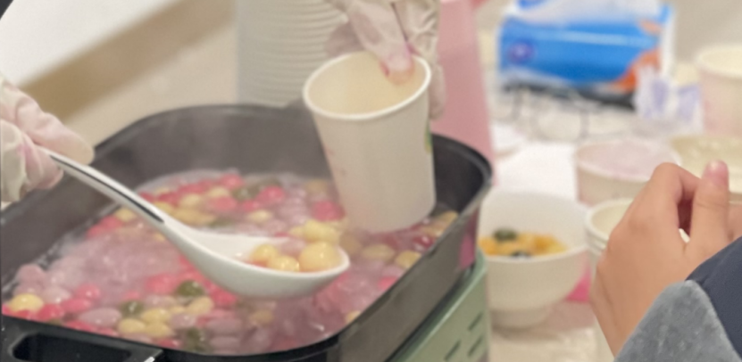 接下来就是最令人激动的品尝时刻。将小圆子装进已经准备好的纸杯里,香滑软糯、风味各异的七彩小圆子在大家的欢声笑语中融化到了唇齿之间。
