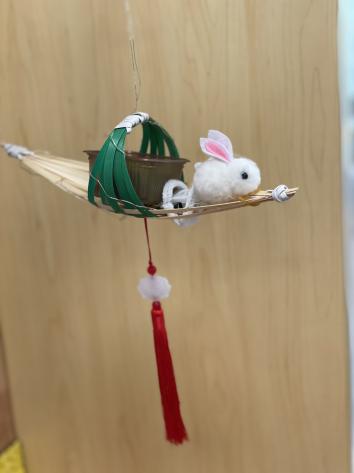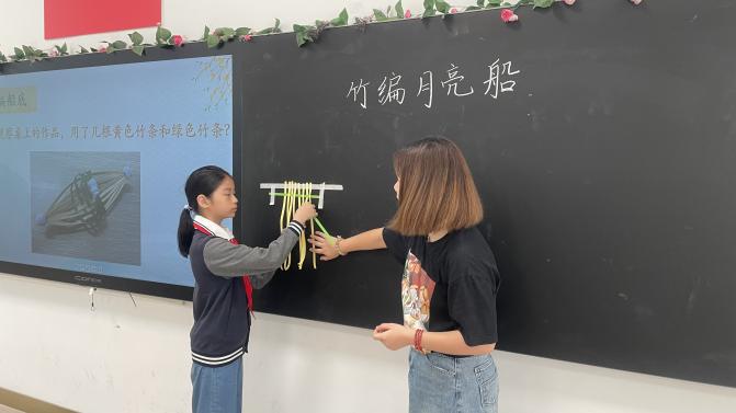 活动伊始,由吴凡老师和五(4)班孩子们带来一节教学展示课——《竹编月亮船》, 这节课以中秋节月亮船的习俗为背景,从制作视频导入,引导学生整体了解制作步骤,在实践中逐一分解,完整体验。通过回顾旧知“十字穿编法”,引导学生主动进行知识迁移,探索并发现新材料的优点和操作技巧,通过“一压一挑”口诀,成功制作出船身。接着,学生自主探究、小组合作,完成提竿、挂绳、灯带,将月亮船灯笼制作完成。学生既提高了动手动脑的能力,也提升了艺术实践能力和创造力。