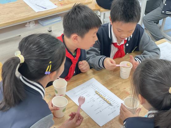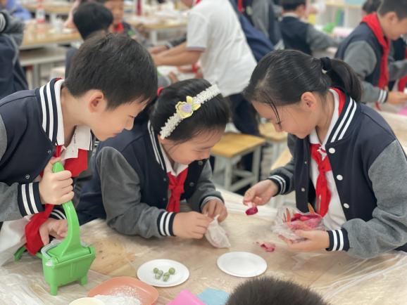 课前,杨老师和孩子们齐心协力准备各种材料和工具,煮锅、糯米粉、揉面盆、一次性小碗、小勺、纸杯、手动压制器、各种有色水果... ...课堂中,同学们纷纷化身“手工小达人”、“美食小博主”,在实践与分享中品味劳动乐趣。