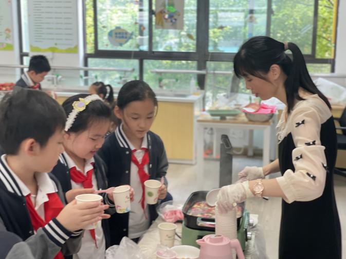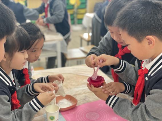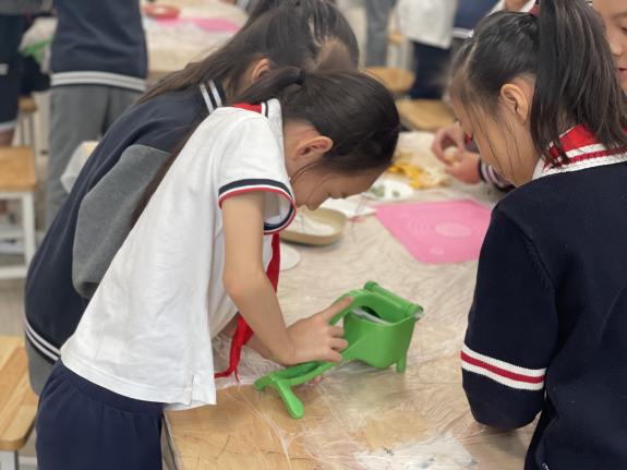 课前,杨老师和孩子们齐心协力准备各种材料和工具,煮锅、糯米粉、揉面盆、一次性小碗、小勺、纸杯、手动压制器、各种有色水果... ...课堂中,同学们纷纷化身“手工小达人”、“美食小博主”,在实践与分享中品味劳动乐趣。
