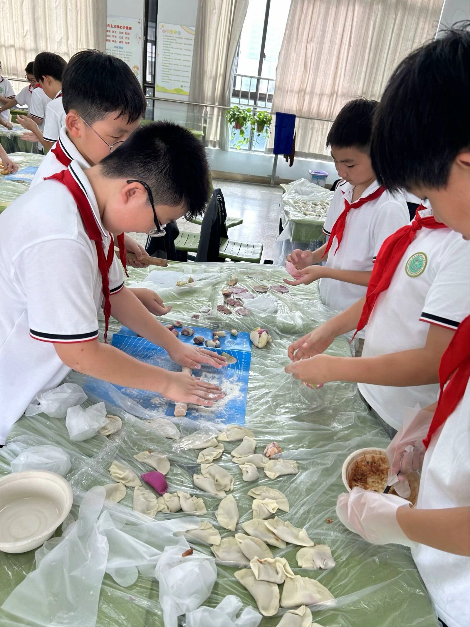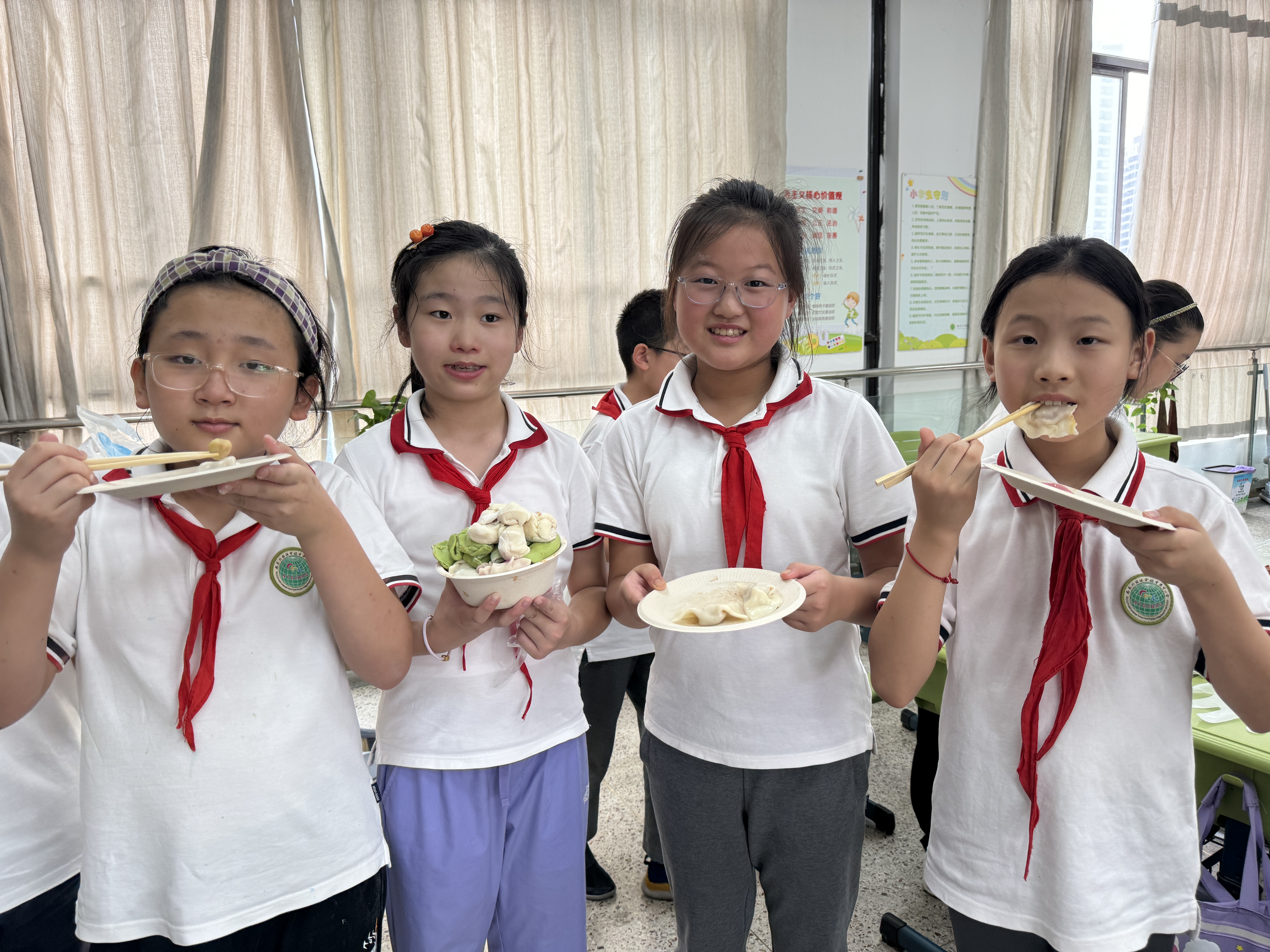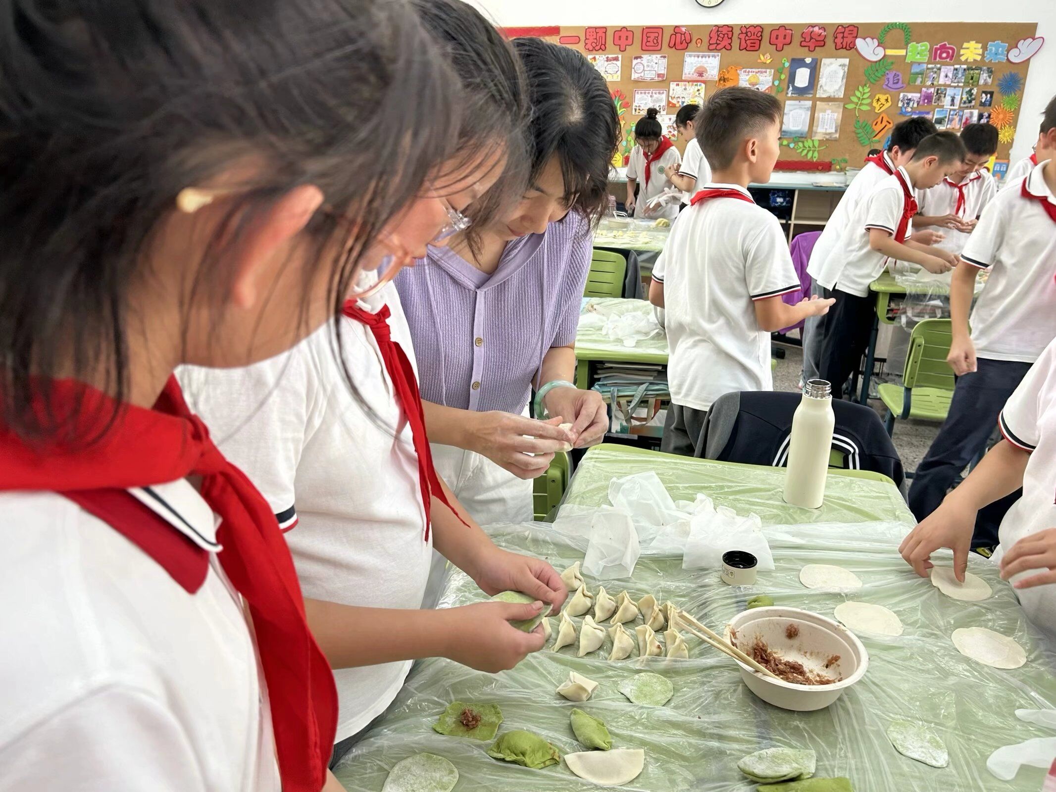 五(3)班:勤劳能干的王乔治妈妈和细心体贴的满瑞杰妈妈忙活了一上午,为孩子们准备好了面粉、水、擀面杖等物品,她们齐心协力把熟悉的东西带进了我们的家长课堂,让孩子们惊叹美味的饺子原来是非常辛苦地一步一步做出来的。让孩子们知道要倍感珍惜粮食!在包饺子的过程中,各种异想天开的包法,形式各样的饺子惹得孩子们开怀大笑,整整一节课都充满了浓浓的生活气息。