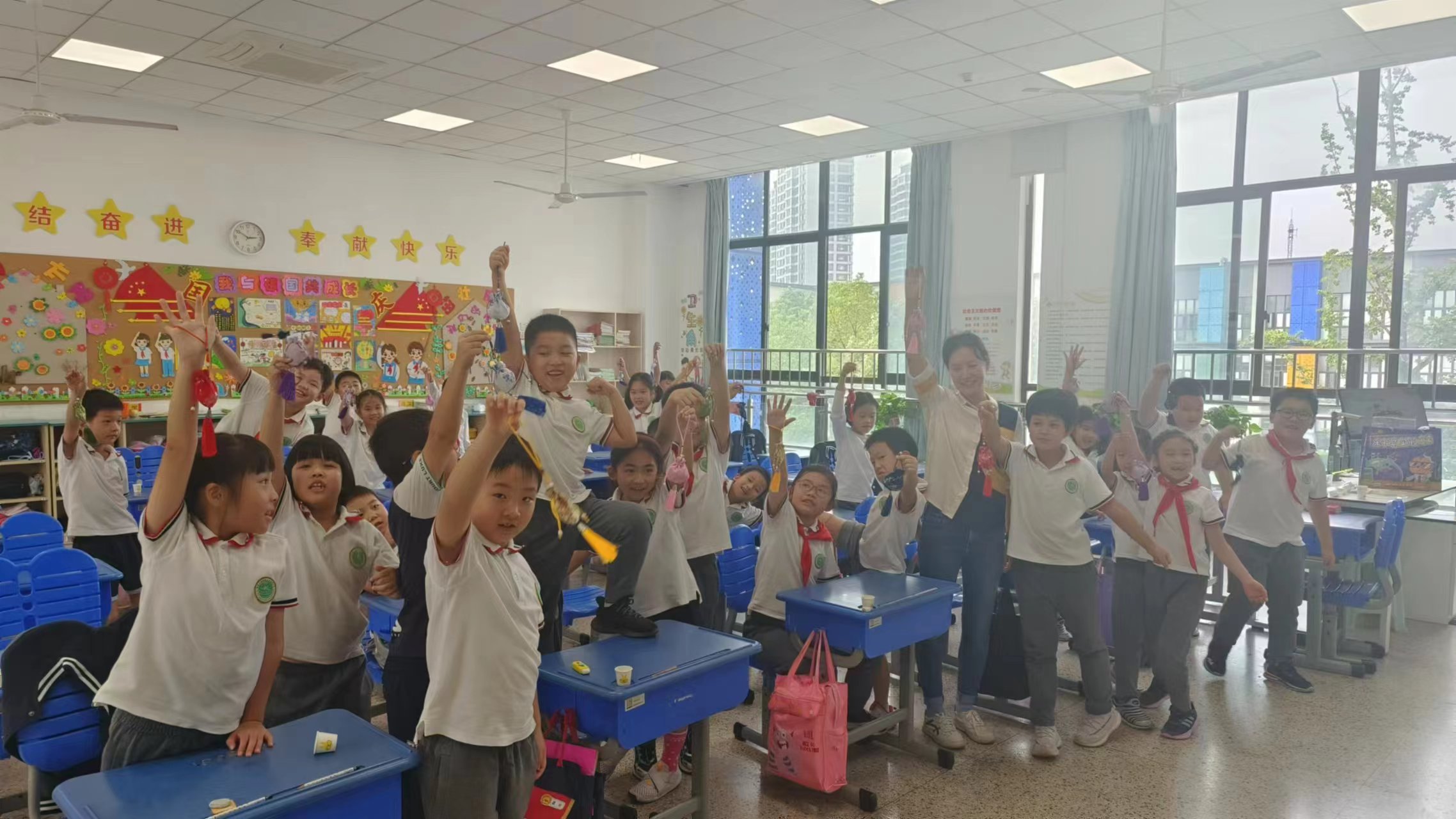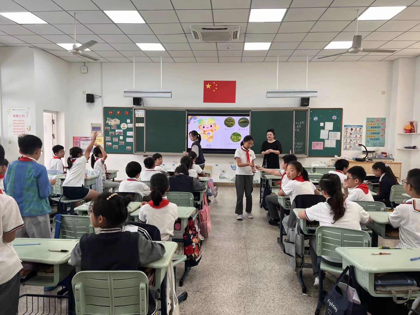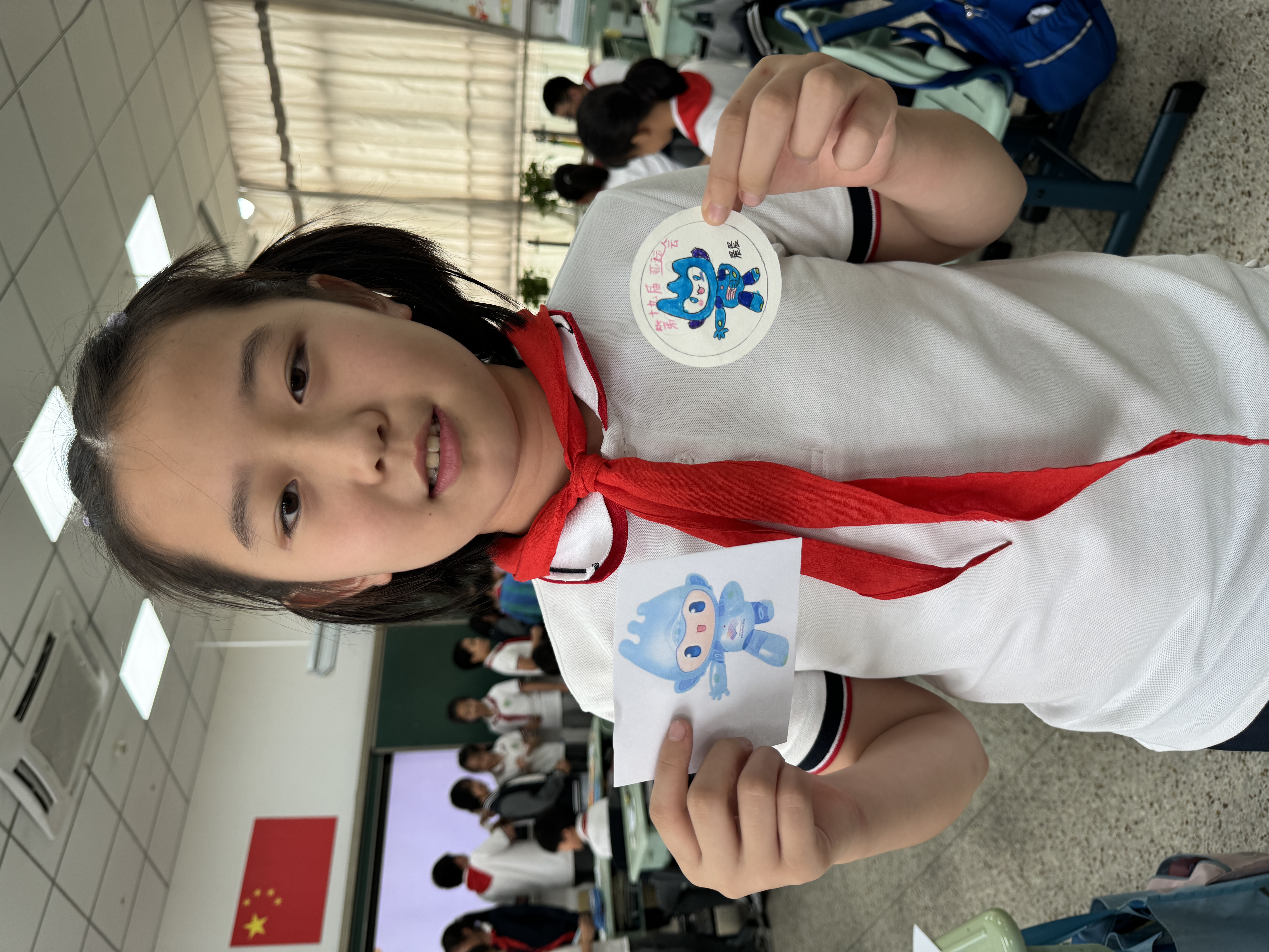 五(2)班:近日一场盛大的体育赛事——第19届杭州亚运会正在杭州如火如荼地举行。张凌语的家长给同学们带来的是《DIY亚运胸章》。课上,同学们通过找不同的方法,分别发现了吉祥物组合“江南忆”异同处,掌握了三只吉祥物的造型特征和设计寓意,再通过VCR,了解到整个绘制的过程与方法。动动双手,DIY胸牌,画一画可爱的“琮琮”、“莲莲”、“宸宸”,亲眼所见小小的一片纸秒变立体胸牌的魔术过程,瞬间激发出同学们的创作热情,现场异常火爆。