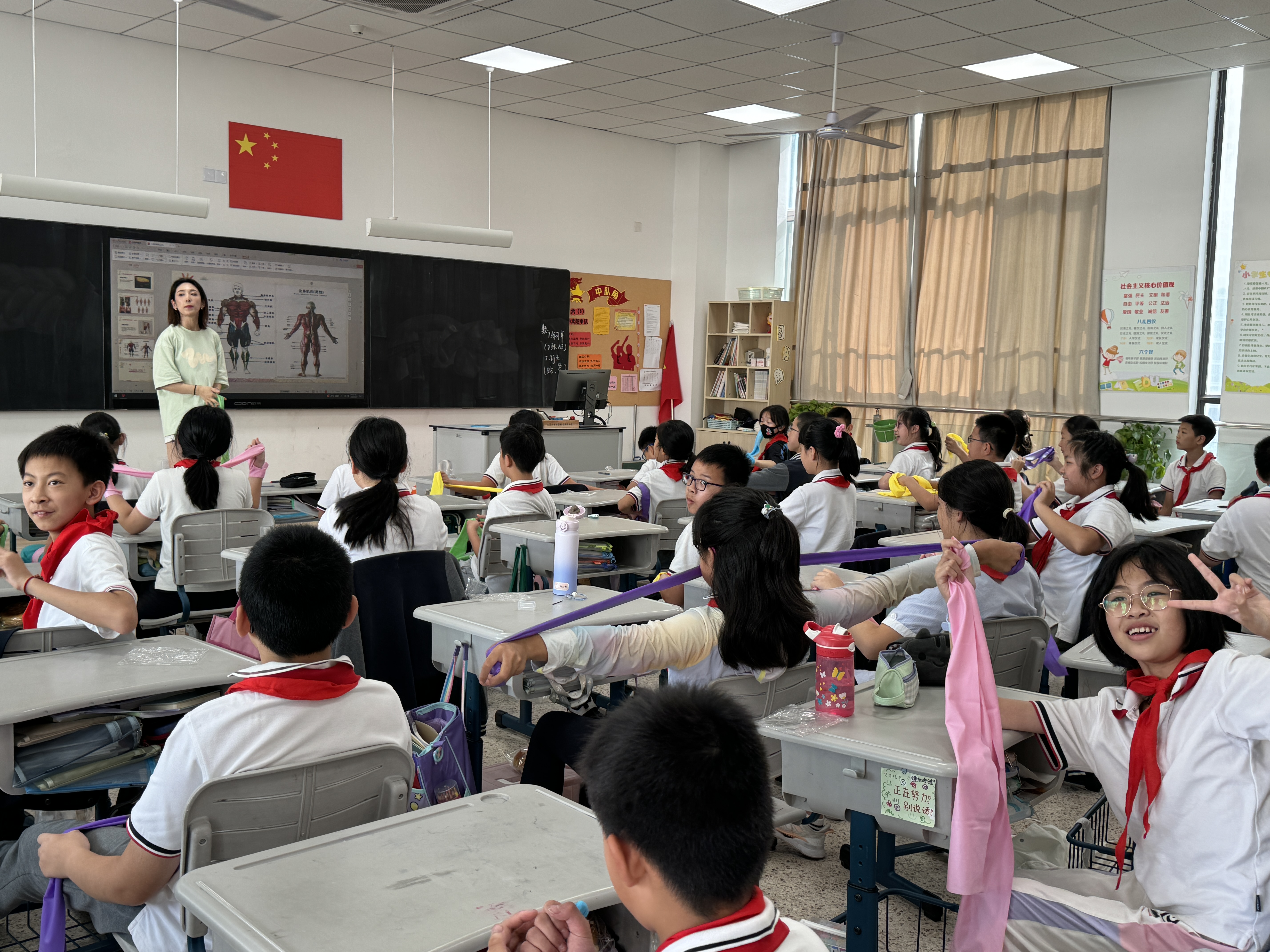 六(5)班:吴可谦妈妈为孩子带来了一节生动有趣又很实用的课堂。通过这节课的学习,学生了解了人体的构造,并知道了肌肉对人体的重要作用。可谦妈妈还利用弹力绳让孩子们动起来,学习几个运动健身的动作。