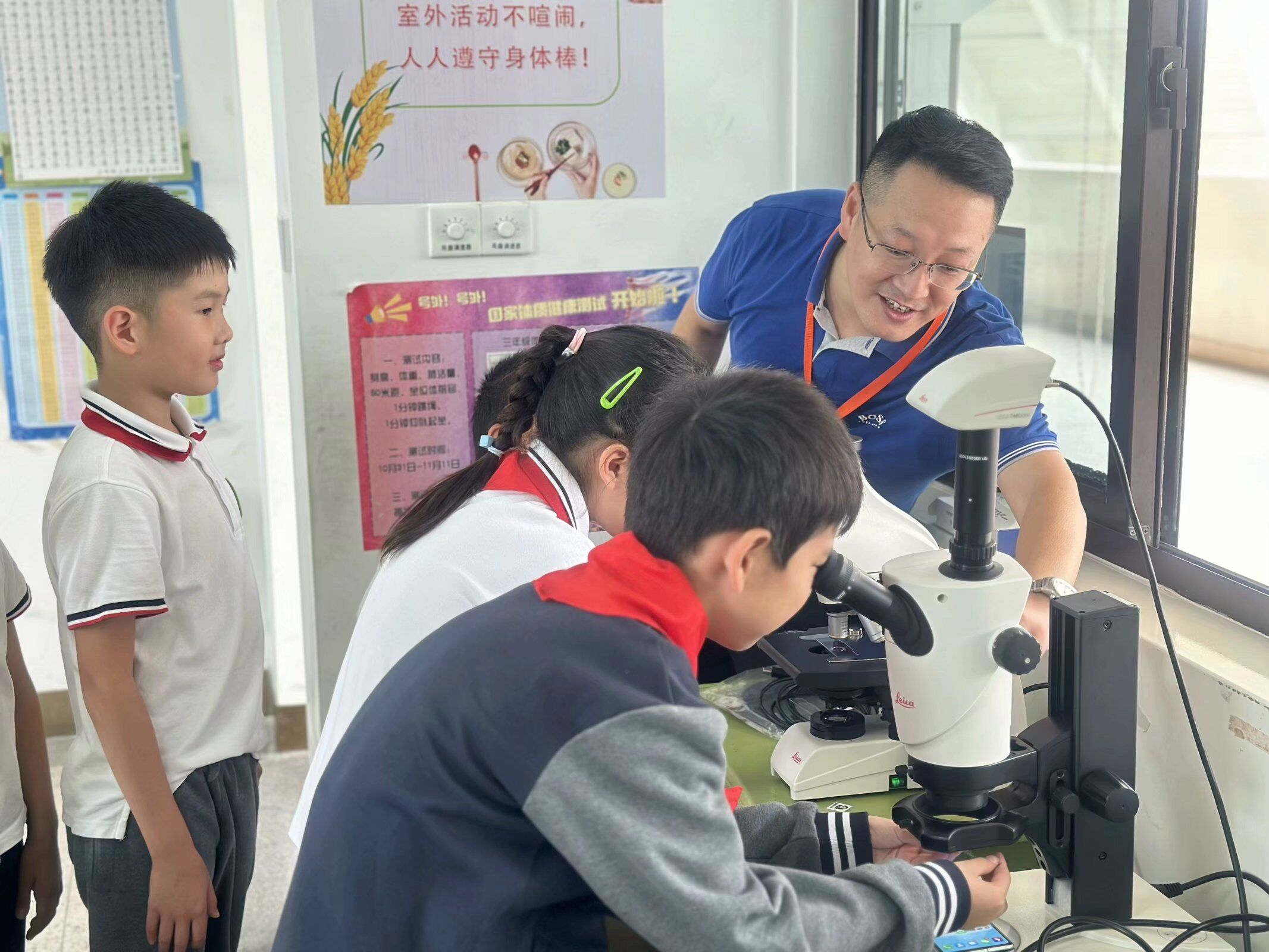 三(4)班: 我们的指尖藏着一个隐形的奇特世界,只有显微镜才能把这个隐秘的维度带到我们眼前。张君妍爸爸带着3台显微镜来到了我们的班级。孩子们各个惊喜万分!君妍爸爸对显微镜的基础知识、成像原理等进行了介绍。孩子们看了洋葱表皮细胞标本和一些树叶、松果的表面,就在那洋葱表皮细胞里,一个个小细胞不规那么地排列着,每个细胞里面还有一个可爱的小细胞核。 最后,孩子们都激动地表示:一定要好好学习,长大后当一名科学家。