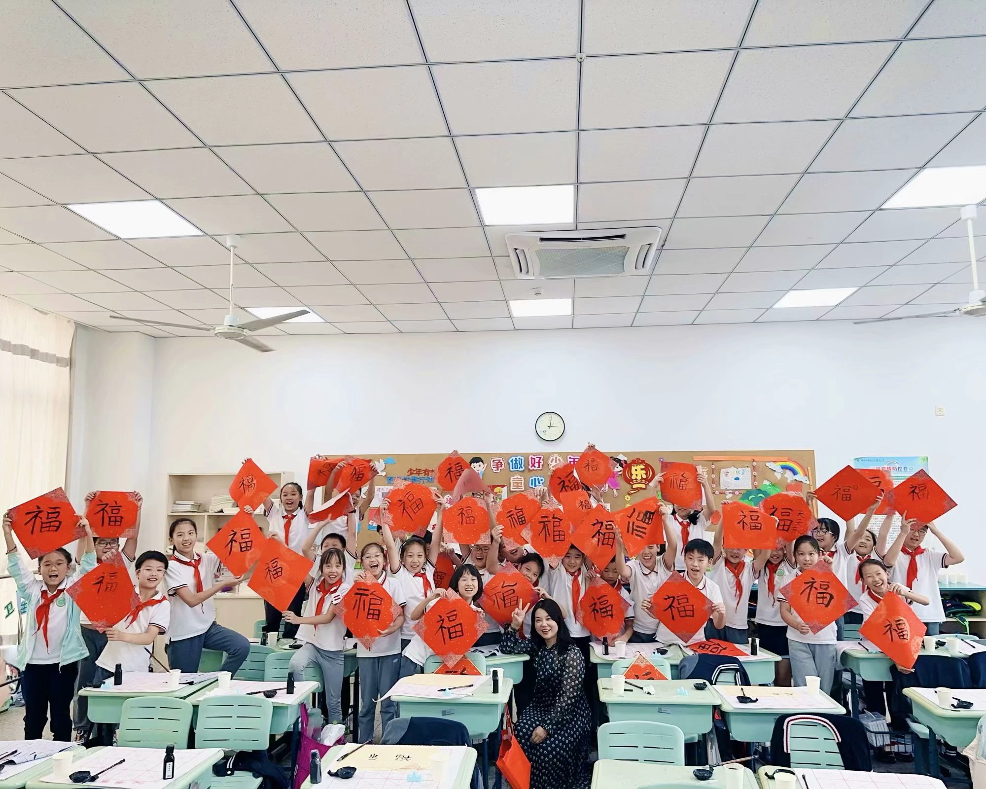 五(1)班:“人生聪明写字始”。身为江苏省书协会员的博文姨妈通过一个个生动的例子、故事向同学们介绍了文房四宝以及书法的起源,同学们在课堂中体验书法魅力,感受中国文化。一运一顿、一浓一淡,博文姨妈用书法与学生进行交流,细心地指导学生们书写“福”字,孩子们在认真练习的同时收获着满满的福气。