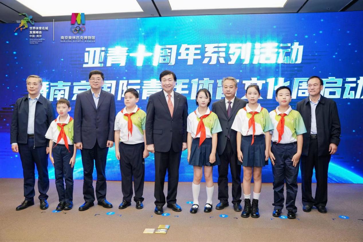 孙煊贻、孙赫帅、王龚梓、 黄尚恩、 陆顾明五位同学与领导嘉宾一起“大手牵小手”见证启动亚青十周年系列活动暨南京国际青年体育文化周。