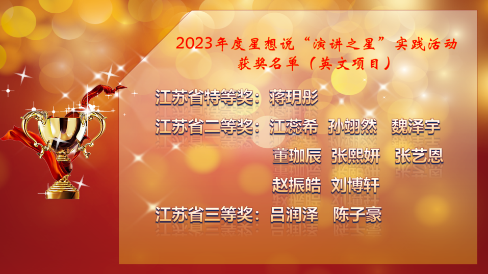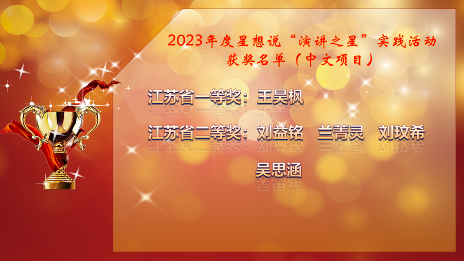 金秋时节,喜报频传。近日,在2022-2023年度星想说“演讲之星”实践活动中,经过市级海选、决选,省级决选及江苏省年度总展示四轮比拼,最终我校16位学子在比赛中脱颖而出,荣获省级奖项!