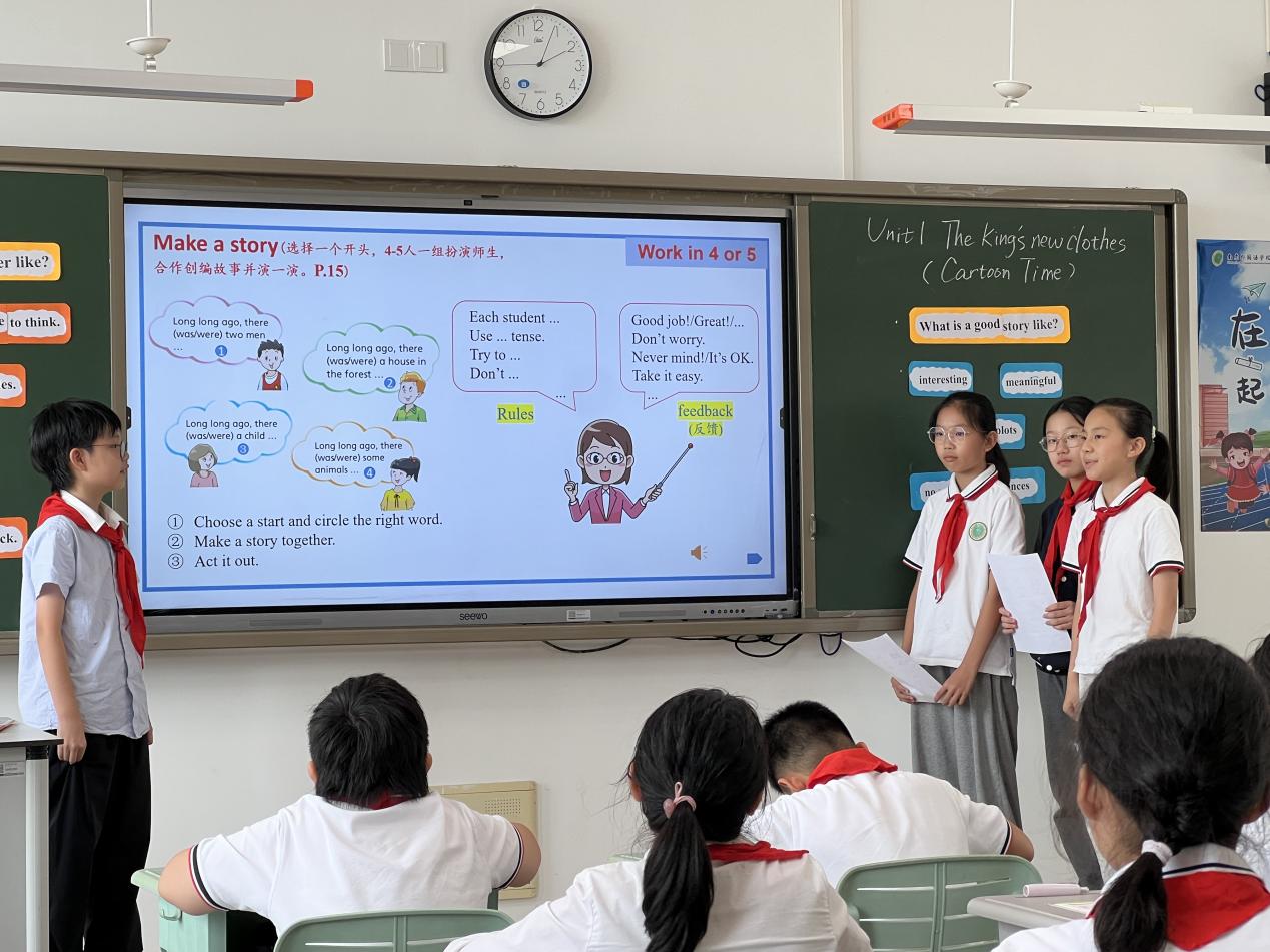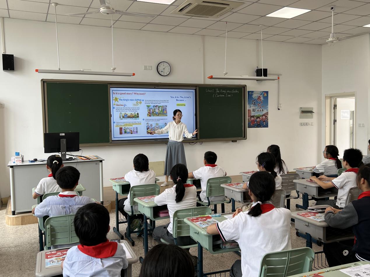 首先,王洁老师带来了一节研讨课,她执教的内容是译林六年级上册Unit 1 The king's new clothes的cartoon time板块。王老师用两个学生熟悉的故事导入,通过对比,让学生感知不同的故事风格。学生深度阅读文本,以Miss Fox的教学组织为线,引导学生提炼关键信息。王老师巧妙设计分层任务,培养学生合作探究、大胆创新、整理归纳等能力。最后学生能够总结出好故事的要素并发挥想象,小组合作,创编出有趣、有意义、新颖的故事。