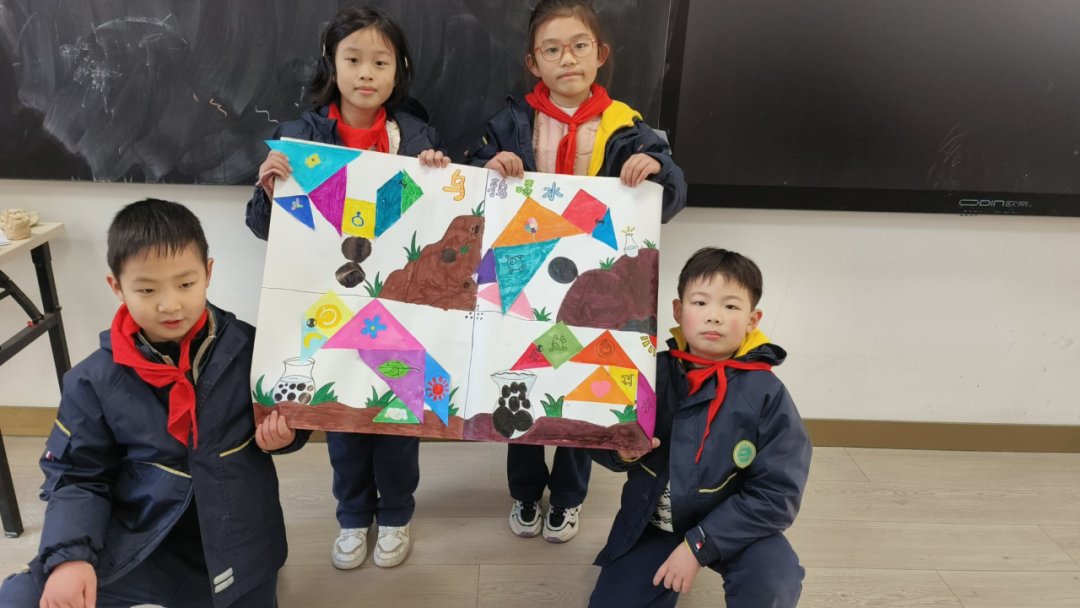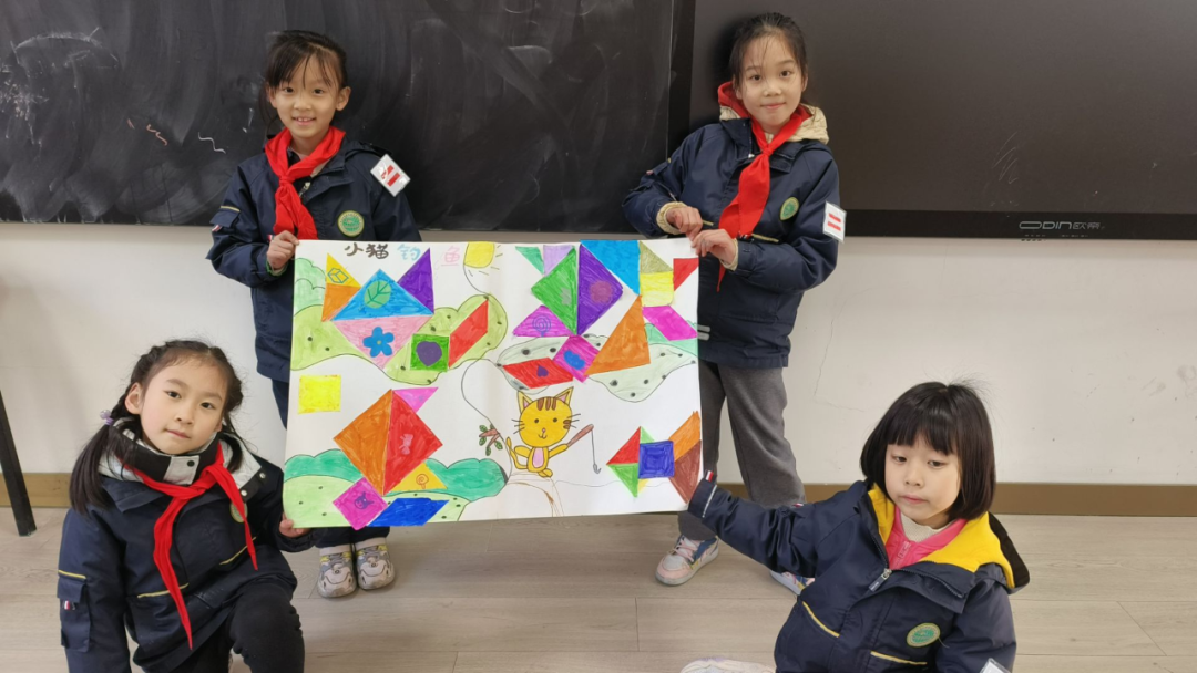 用七巧板拼图形并不难,但是用自己制作的七巧板拼出创意故事可不简单哦!二年级的小朋友们用一张正方形纸折出七巧板。瞧,先折一个“X”,再折出一个“V”,最后折一个“L”,一副七巧板就被折出来了。彩笔在七巧板上沙沙划过,每一个图形都被赋予了色彩,再经过创意拼组,七巧板就拼成了一个个栩栩如生的形象,组成了一个个生动的故事。一起看看吧!