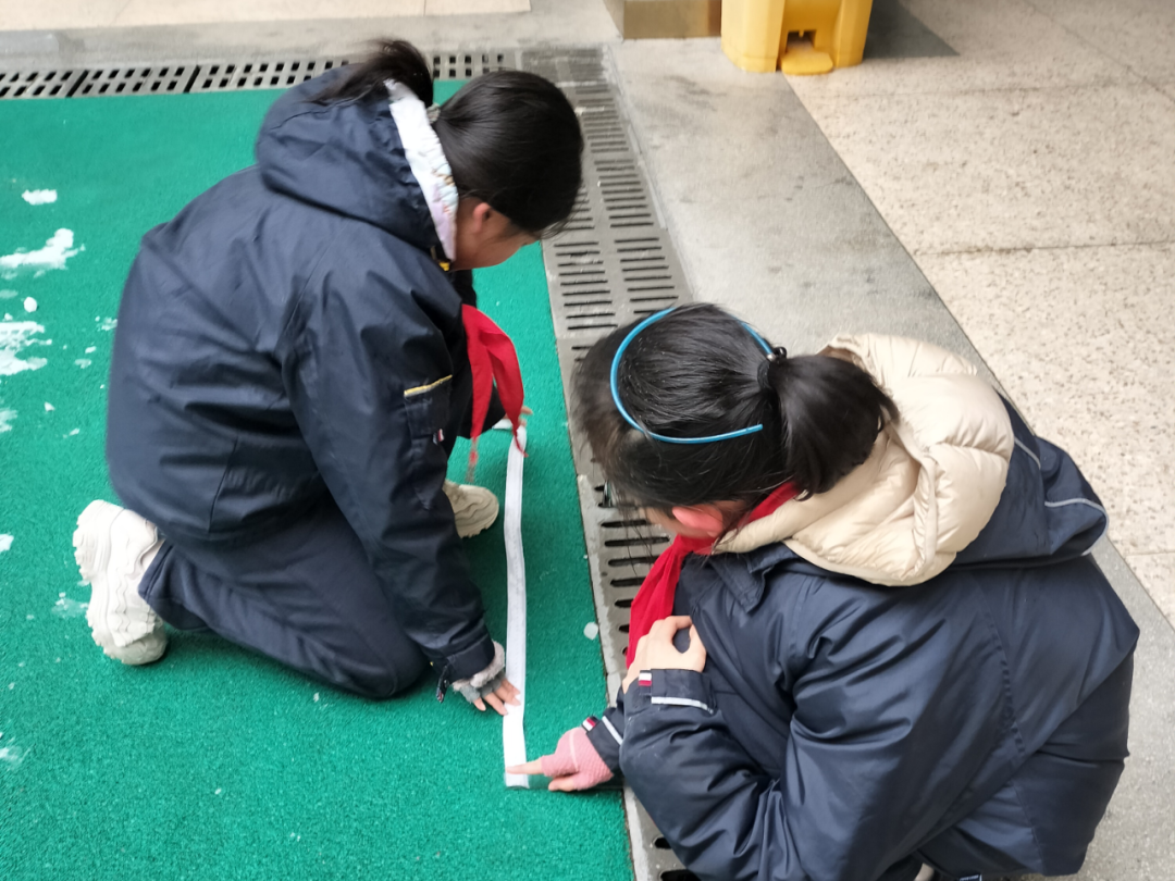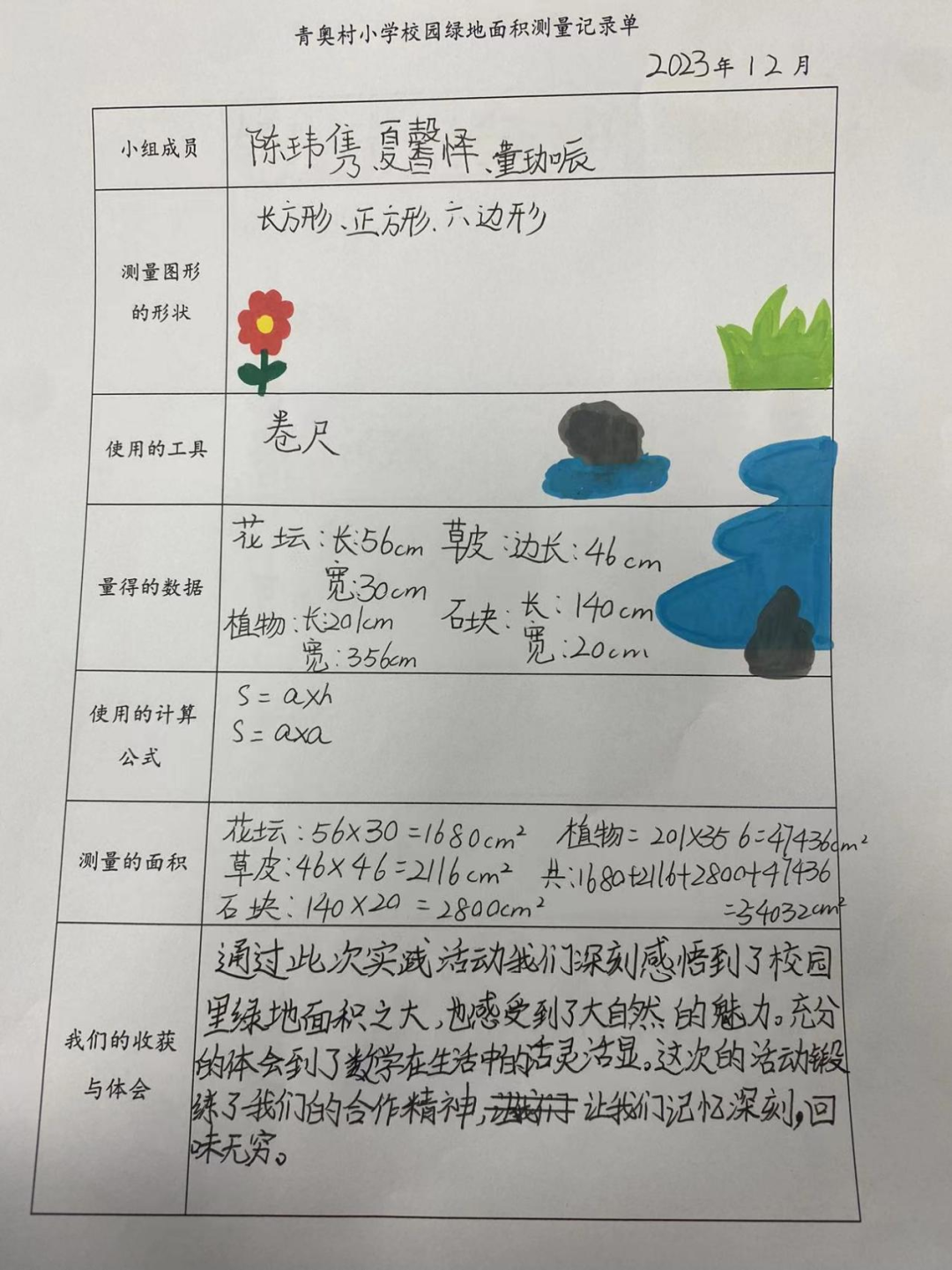 五年级的同学们以本学期所学的多边形面积为基础,利用面积计算公式和测量工具,走出课堂,走进校园,测量校园中的绿地面积。在活动过程中,同学们积极合作,合理利用所学知识,测量和计算出校园中较大地形或者不规则图形的面积。