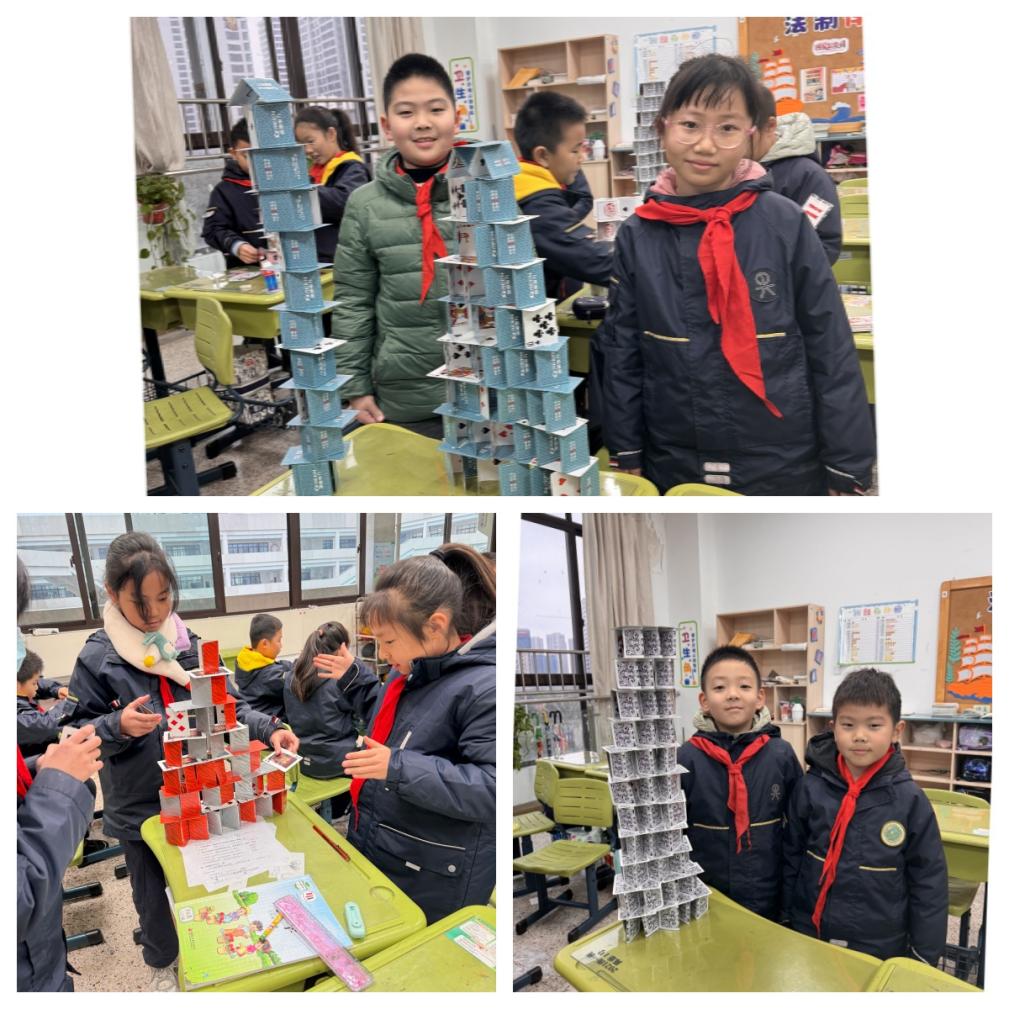 三年级开展了“挑战纸牌塔”的活动,同学们或一人独立挑战,或两三人合作搭建,他们一个个屏住呼吸,轻手轻脚,有的折,有的扶,教室里到处洋溢着紧张的气氛,时不时还传来“哎呀!又塌了——”的叹息声。在一次次的失败中,每一位同学都能很快调整情绪,互相鼓励,再重新一层一层地搭起来。没多久,一座座形态各异的“小塔”就竖了起来!
