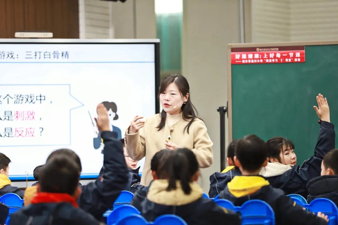 第二节课由海英小学张芯蕊老师执教五年级科学课《从刺激到反应》。张老师从有趣的游戏导入,唤醒学生关于刺激与反应的已有认知。然后运用前置性学习策略,通过画图活动,让学生充分暴露前概念。接着,学生按照“观点相似”重新分组,开展组内自学和全班共学,在教师的引导下,形成人体神经系统的概念建构。最后,在应用环节,教师出示了三个话题,学生按兴趣再一次重新分组,参与不同的话题讨论,实现概念的运用与迁移。这节课从学生的认知起点出发,为不同学习储备的学生设计了相应的任务单,体现了因材施教。