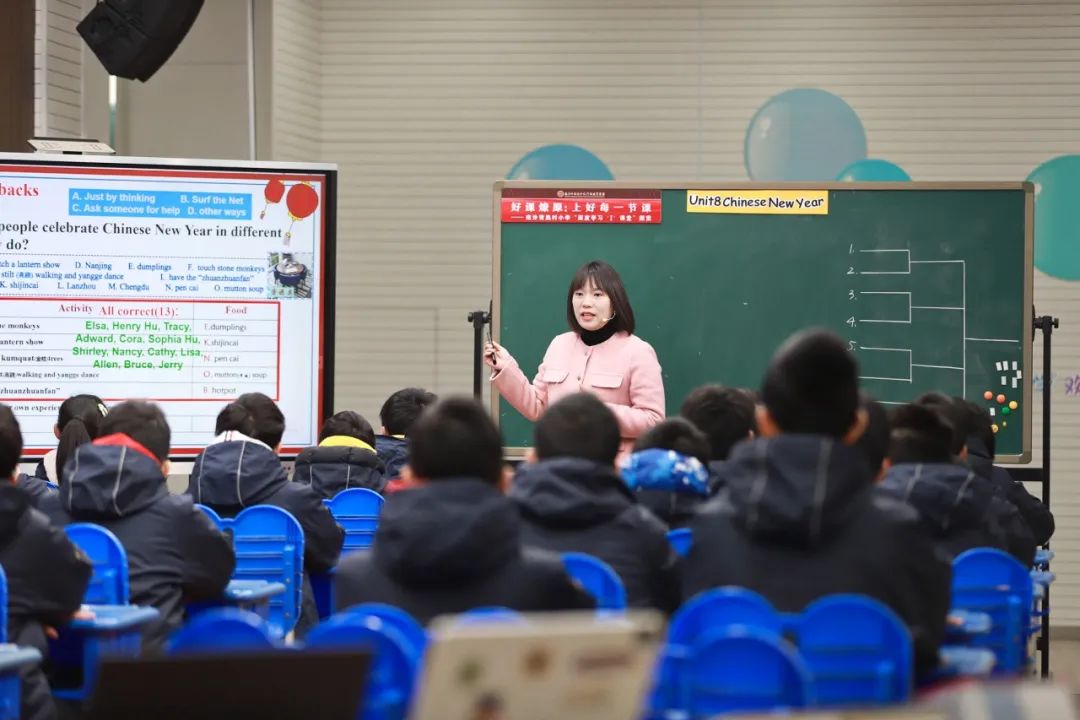 在课堂教学环节中,我校的周培蓓校长以译林英语六年级上册《Unit8 ChineseNewYear Story time》第二课时为例,立足于小班差异化教学研究,采用了八个不同的差异化教学策略进行教学展示。周校长通过学前测了解学生们学情和生活经验,对学生们进行了灵活的分组。课堂上环节多样、精彩纷呈:有学前测的反馈;有Magic eyes游戏复习旧知;有两大组PK,比拼哪一组能说出更多不同城市的春节活动和代表食物;有同质分组和异质分组,学生通过精读课文和补充材料,在找到文本中出现的春节活动和代表食物的同时,借助资源桌,挖掘出这些春节活动和代表食物的背后含义。最后学生们在老师的引领下根据能力水平自由分成四大组,每组选出2个春节关键词,如Happiness幸福,Reunion团圆,Wishes愿望等等,利用优先赛策略,最后决出最能代表本班的春节关键词。
