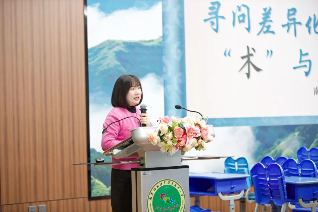 接着,海英小学的张煜妍老师开设讲座《寻问差异化教学的“术”与“道”》。“道”即是理论知识,“术”即是方式方法。张老师从理论与实践两方面阐述了差异化教学的“道”与“术”。差异教学是指"在班集体教学中,立足学生的个性差异,满足不同学生的学习需要,促进每个学生最大限度发展的教学"。她还结合具体的教学案例和大家分享了三个差异化教学策略:全面动态测查学生差异的策略,及时反馈与调整教学的策略,隐形动态分层与互补合作结合的策略。她和她的学生也都在差异化教学课堂中成长着,进步着。