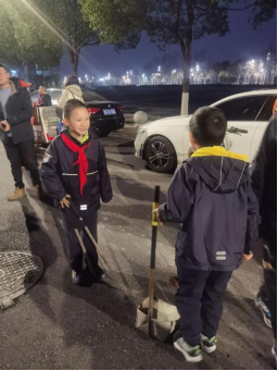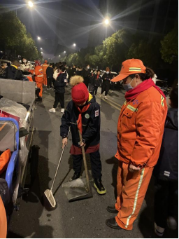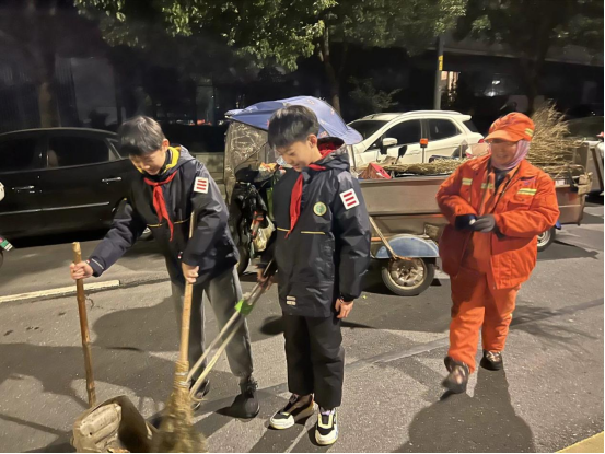赠送姜茶的仪式结束后,志愿者们没有离开,而是自发的跟随环卫叔叔阿姨的脚步,继续参加清扫街道、捡拾垃圾等志愿服务,在劳动实践中感受城市建设者的辛劳。