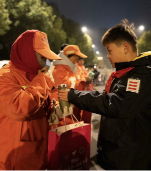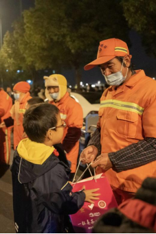 “谢谢您,感谢您让我们有了整洁的道路环境。”小志愿者们满怀感激。除了姜茶,他们还拿出自己精心准备的手套、围巾、袜子等保暖礼物赠送给环卫叔叔阿姨们。一双双小手传递着爱心,传递着感恩,更传递着作为新时代少先队员的使命感和责任感。