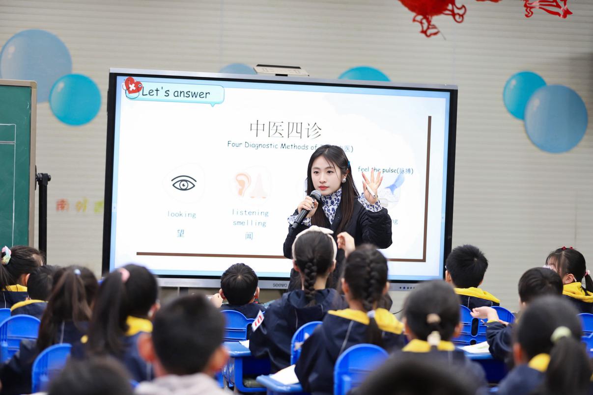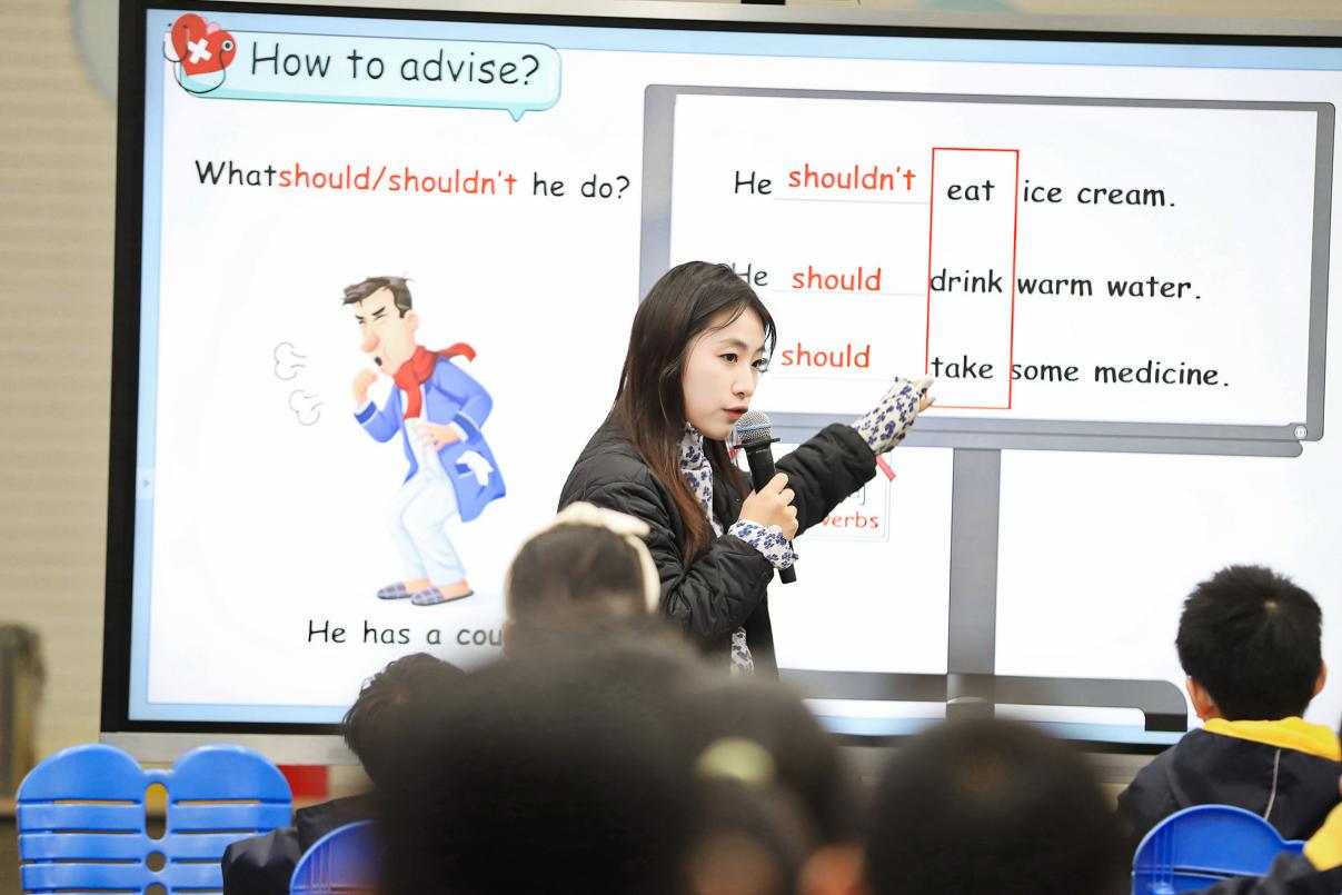 来自河西南外小学部的刘书含老师执教第二节课,教学内容为GrammarFun time。刘老师将How do doctors help the patients?作为主线问题,贯穿教学始终。刘老师设置真实的看病场景,引导学生结合中医“四诊法”,通过角色扮演,根据不同病情提出合适的建议。学生们不仅在活动中感受到了当医生的乐趣,也在情境中学会了如何使用should/shouldn’t等提出建议的表达方式,提升了学生的综合语言运用能力。最后,刘老师结合绘本内容达成育人目标,提倡学生们要养成良好的生活习惯,拥有健康的体魄。