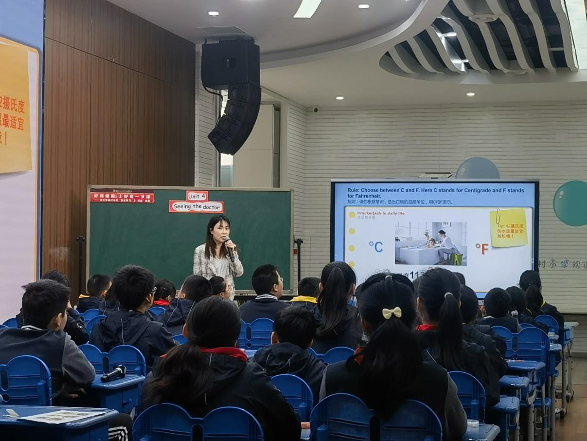 第三节课由来自莲花小学的贾婷婷老师执教,教学内容为Cartoon, SoundCulture time。贾老师教态亲切,课文不同板块间的衔接流畅。首先,贾老师通过对单元已学板块的整体复习,引出Culture time,并通过有趣的游戏帮助学生区分并记忆摄氏度和华氏度。接着,贾老师引导学生观察图片,并用图片上的信息填空,帮助学生自己发现并总结ch的读音。在cartoontime板块的教学中,贾老师在带领学生充分理解课文内容的基础上,引导并启发学生思考接下来发生的故事,续编故事和表演活动充分调动了学生的积极性也培养了学生的创新性思维能力。