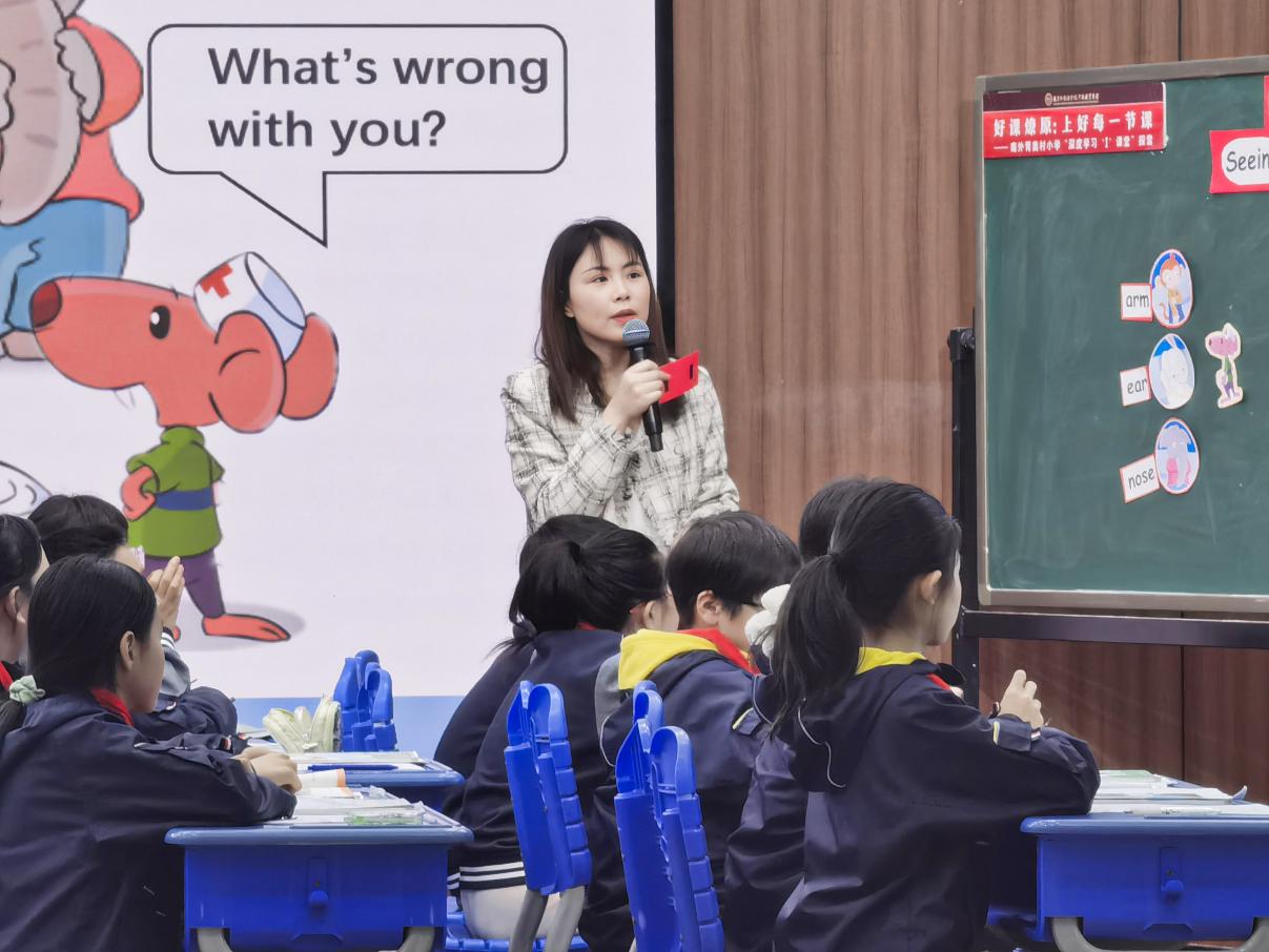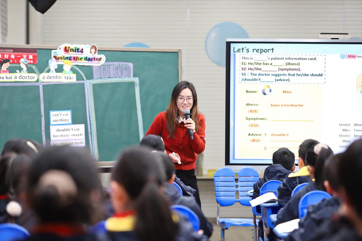 首先,我校赖慧老师带来Story time板块的教学。赖老师的课堂注重学生的学习体验,学生通过完成patient information cards,充分理解story time文本内容。赖老师给予他们相应的语言支架,辅助学生进行小组汇报,提升他们综合语言应用能力。赖老师在设计学习理解类活动的基础上,联系学生的日常生活,进一步设计应用实践和迁移创新类的学习活动。正值春季流感高发,通过一张张真实的病历带领学生巩固本课语言和话题,并请来了校医朱老师,和大家一起讨论如何预防流感。最后,赖老师带着学生一起chant,让他们更加深刻地了解拥有健康生活方式的重要性。
