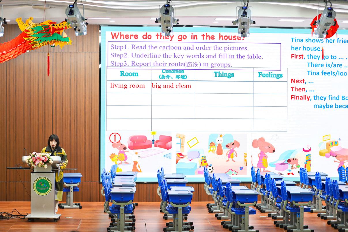 首先,我校赖慧老师带来Story time板块的教学。赖老师的课堂注重学生的学习体验,学生通过完成patient information cards,充分理解story time文本内容。赖老师给予他们相应的语言支架,辅助学生进行小组汇报,提升他们综合语言应用能力。赖老师在设计学习理解类活动的基础上,联系学生的日常生活,进一步设计应用实践和迁移创新类的学习活动。正值春季流感高发,通过一张张真实的病历带领学生巩固本课语言和话题,并请来了校医朱老师,和大家一起讨论如何预防流感。最后,赖老师带着学生一起chant,让他们更加深刻地了解拥有健康生活方式的重要性。