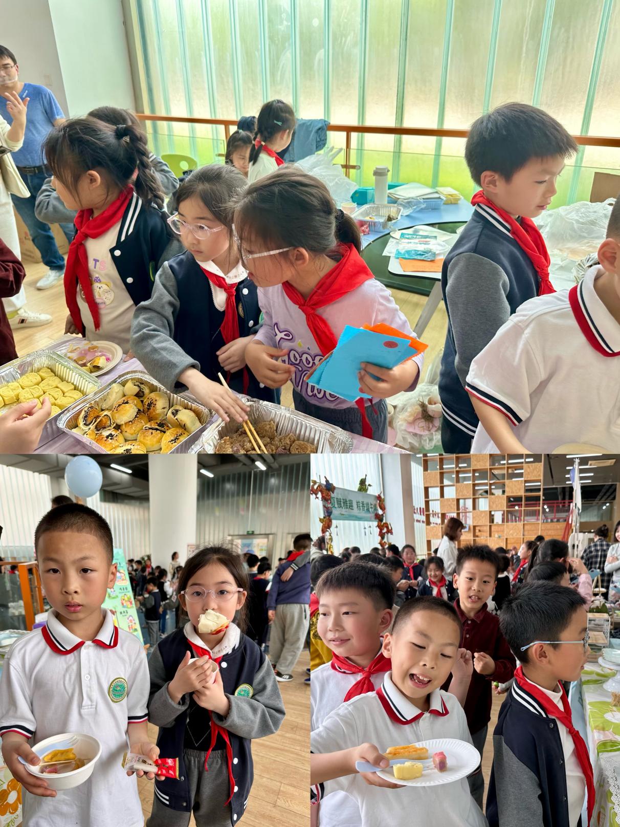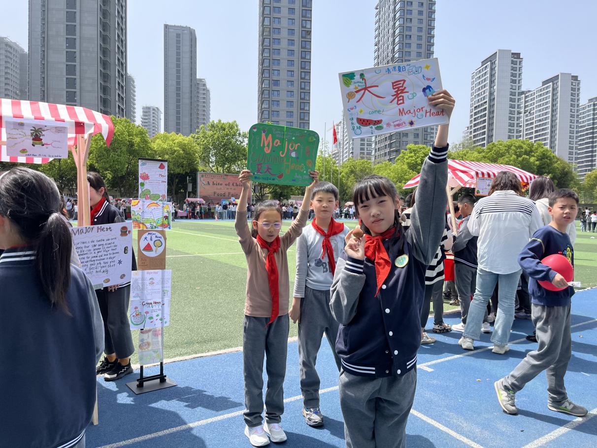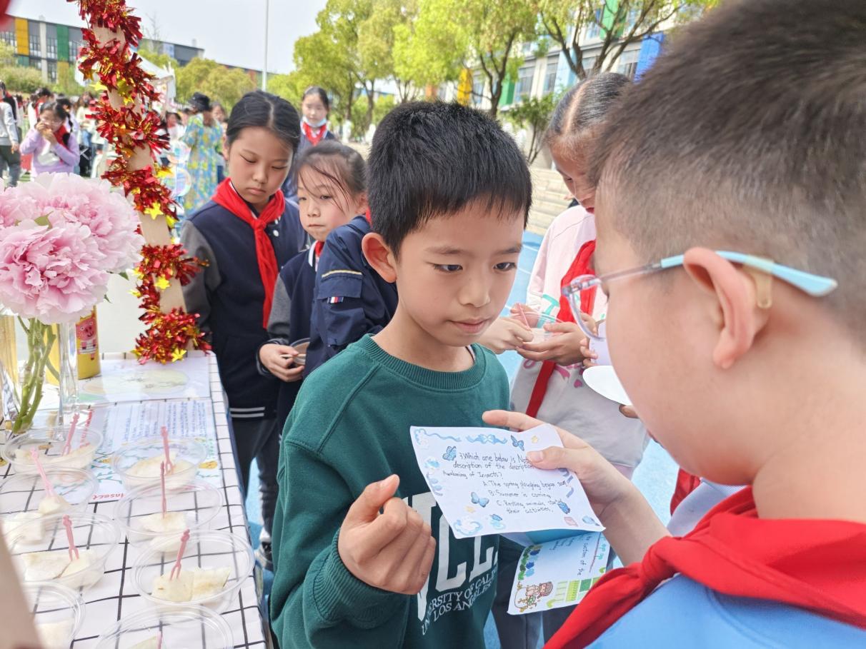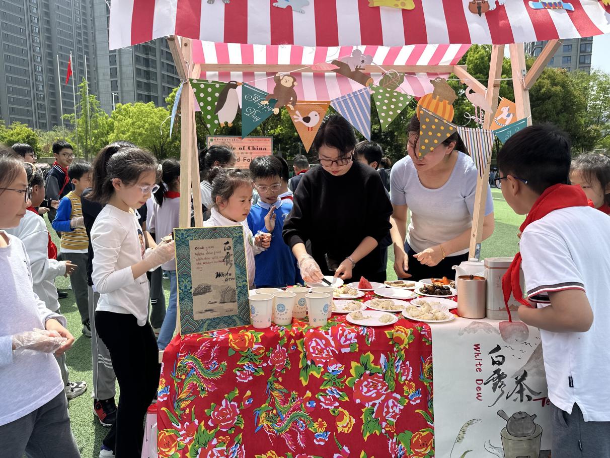 在每个节气来临之际,都有与之相匹配的特色食物上市。看,中年段的摊位上展示着同学们制作的节气美食英语小报,这些小报将节气美食文化展现得淋漓尽致。比如在清明时节,我们可以品尝到清香软糯的青团,感受到春天的清新。在霜降时节,我们可以品尝到甜而不腻的柿饼,体验到大自然的馈赠。同学们自行准备问题对光顾摊位的食客们展开互动:“What do people eat at the Start of Autumn?” “What is ‘冬至’?”等等。由于在前期的小报制作和学习中同学们已经有了一定的知识储备,现场就活学活用起来,他们用准确、地道的语言对答如流,赢得了自己心念已久的食物。集市现场三年级的谭云姗同学还接受了采访,“I like this fair so much. The food is yummy. We buy and sell food in English. Everyone gets the chance to taste it. I enjoy every minute of it”。 这些二十四节气中的特色美食不仅让同学们的味蕾得到了满足,也让他们学会采用不同的方式宣传中国传统美食,进一步弘扬了中化民族优良饮食传统。