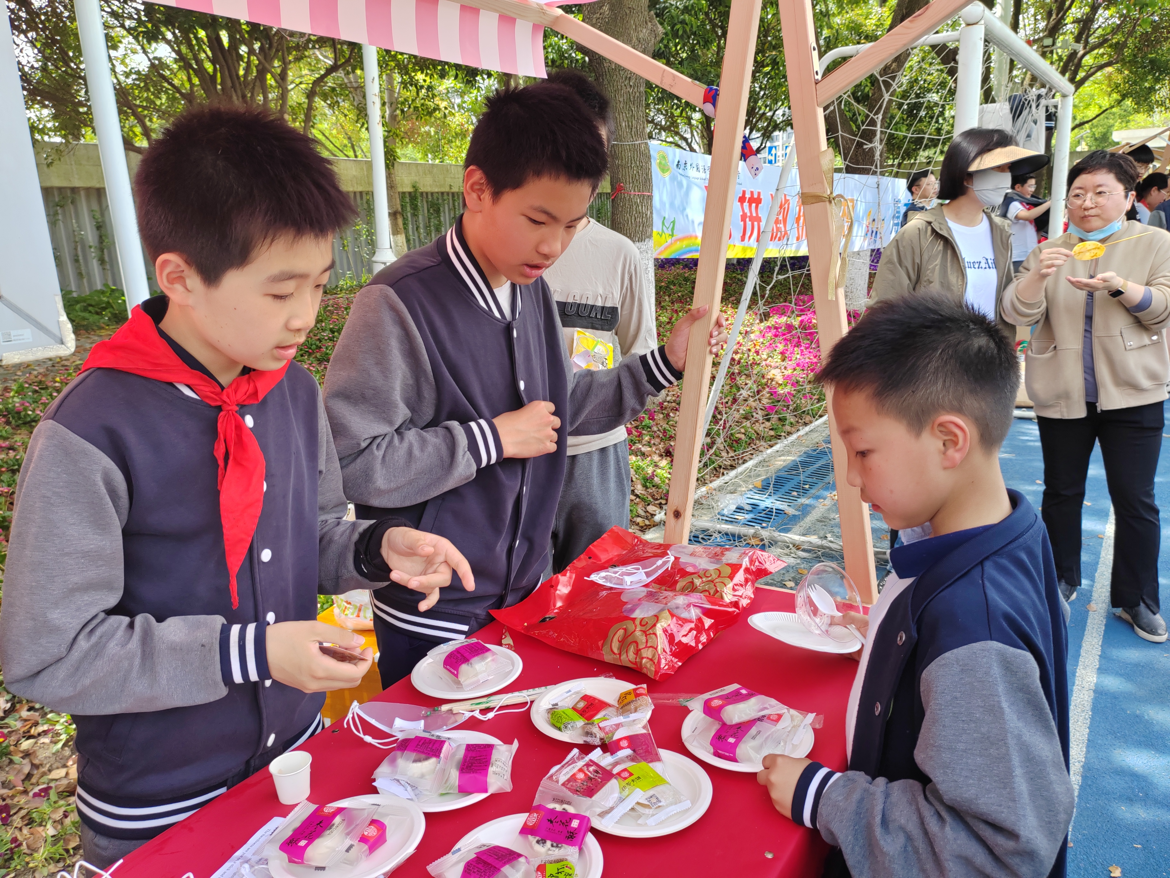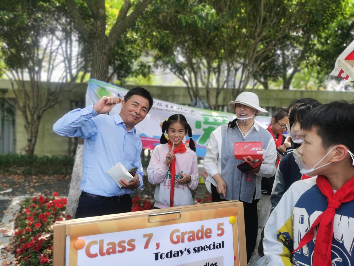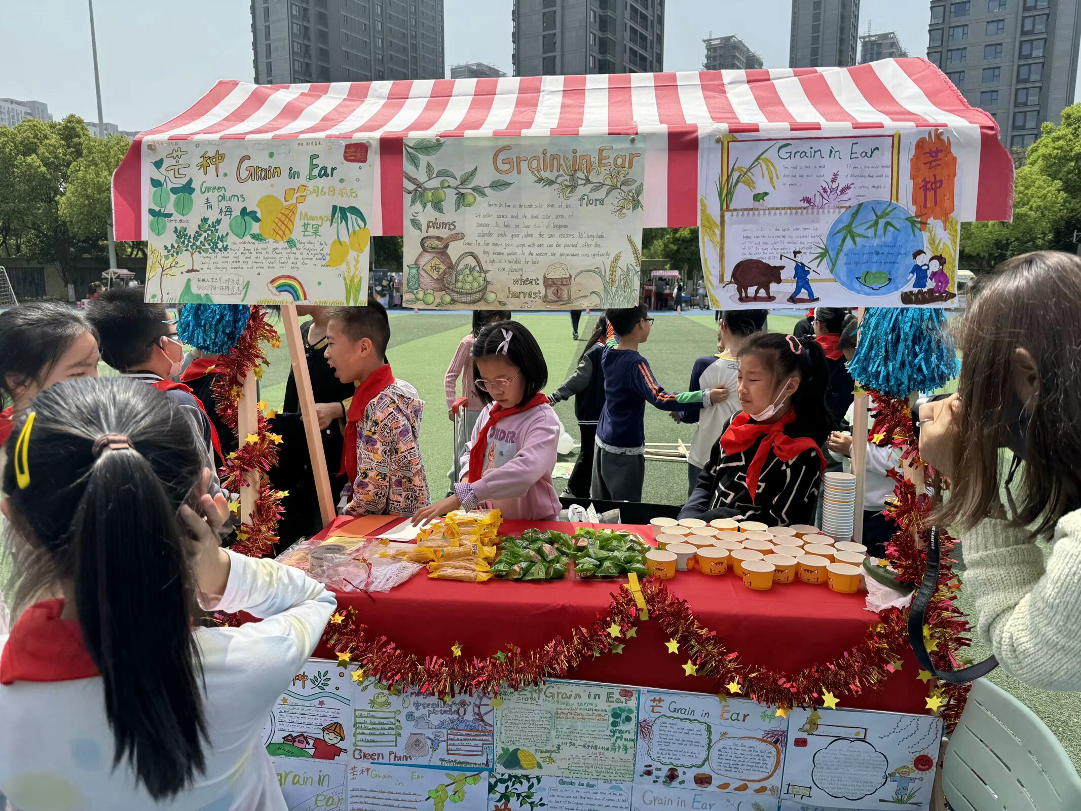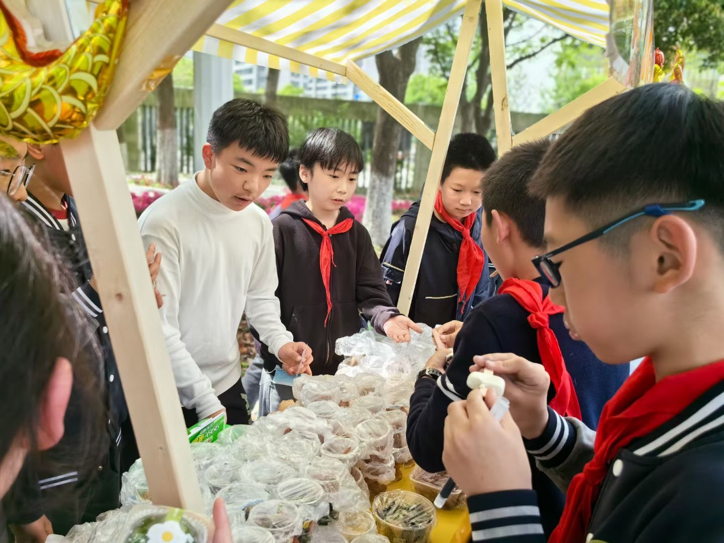 在每个节气来临之际,都有与之相匹配的特色食物上市。看,中年段的摊位上展示着同学们制作的节气美食英语小报,这些小报将节气美食文化展现得淋漓尽致。比如在清明时节,我们可以品尝到清香软糯的青团,感受到春天的清新。在霜降时节,我们可以品尝到甜而不腻的柿饼,体验到大自然的馈赠。同学们自行准备问题对光顾摊位的食客们展开互动:“What do people eat at the Start of Autumn?” “What is ‘冬至’?”等等。由于在前期的小报制作和学习中同学们已经有了一定的知识储备,现场就活学活用起来,他们用准确、地道的语言对答如流,赢得了自己心念已久的食物。集市现场三年级的谭云姗同学还接受了采访,“I like this fair so much. The food is yummy. We buy and sell food in English. Everyone gets the chance to taste it. I enjoy every minute of it”。 这些二十四节气中的特色美食不仅让同学们的味蕾得到了满足,也让他们学会采用不同的方式宣传中国传统美食,进一步弘扬了中化民族优良饮食传统。