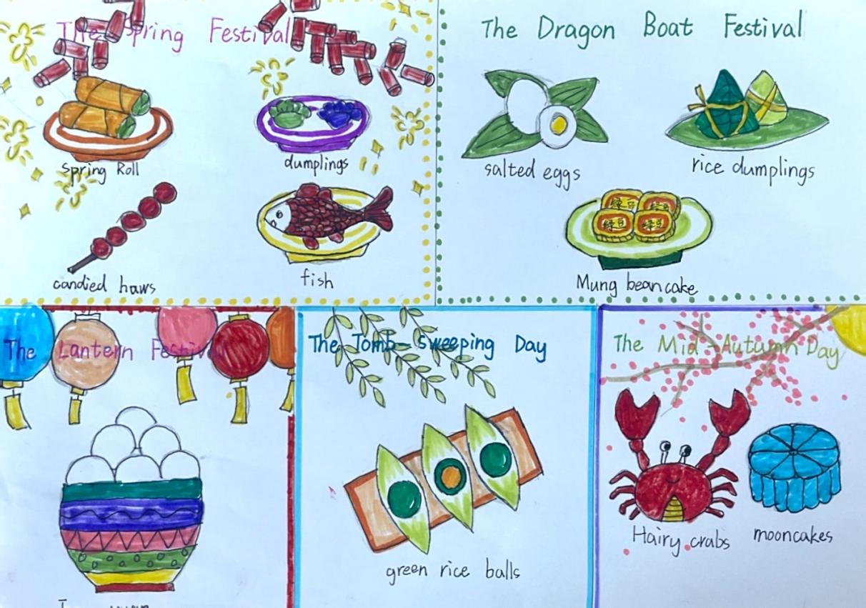 在接下来的一周时间里,一至六年级同学们从“节日里的美食”“节气里的美食”和“城市里的美食”三个子主题开展了丰富多彩的活动,感受到英语的魅力,体验了中华美食文化的深厚底蕴。