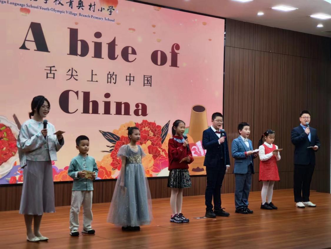 一段由六年级陈禹旬和孙可昕两位同学带来的英语相声展示了六年级孩子扎实的语言功底和对地域美食的喜爱。他们通过对特种兵旅游这一新鲜生活方式的探讨展开了“中国美食知多少”的比拼游戏。随着一段以中国各地美食为主题的歌曲唱跳串烧表演,开幕式进入了高潮——The bite of China, 南外青奥村小学第八届外语节开幕啦!