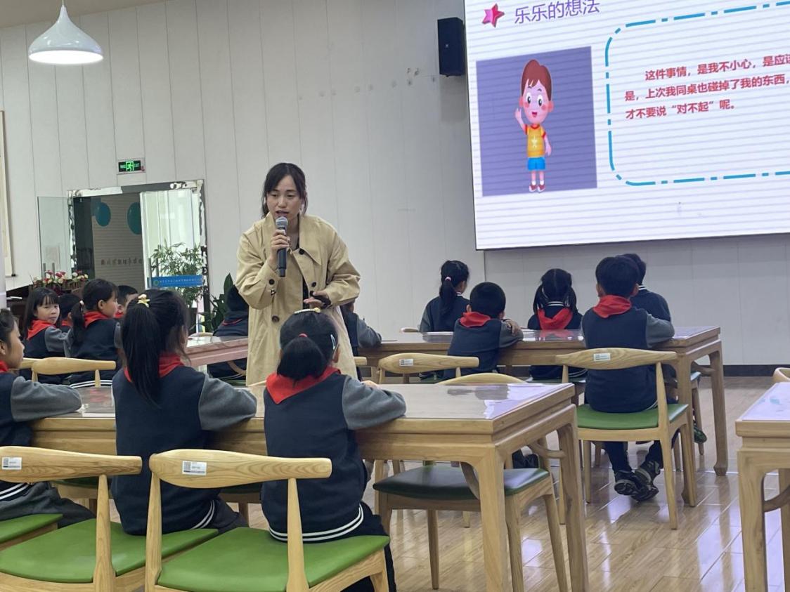 南外河西二附小的陶沙老师带来的《我会说“对不起”》一课,借助故事先让孩子知友善,又通过具体案例的讨论让孩子们了解“对不起”背后的真实含义,使学生学会如何与他人建立友善的关系。