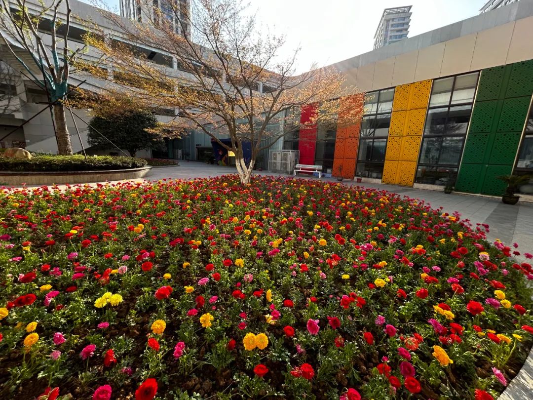 这些敬爱的“老朋友们”不时驻足观看,不时询问着关于校园建设的点点滴滴,对每一处新景都流露出浓厚的兴趣。有的老教师们还拿出了专业的摄像设备,记录校园中的美好:花儿如繁星般点缀在校园的每一个角落,每一寸土地都仿佛被赋予了新的生命;孔雀们优雅地漫步在校园中,温顺的羊儿们偶尔低头觅食,偶尔抬头望向远方,为青奥园增添了一抹灵动之美;绿油油的青菜地,更是展现出蓬勃的生机与活力;善行园内的中式园林景致与悠然自得的鸭子相映成趣,共同勾勒出一幅和谐自然的美丽画卷,令人陶醉其中……